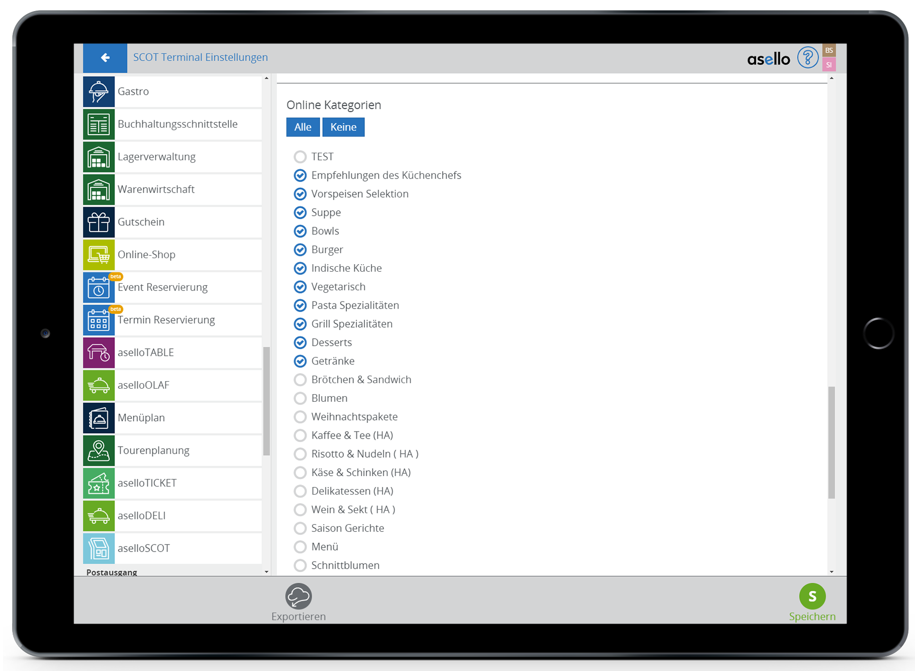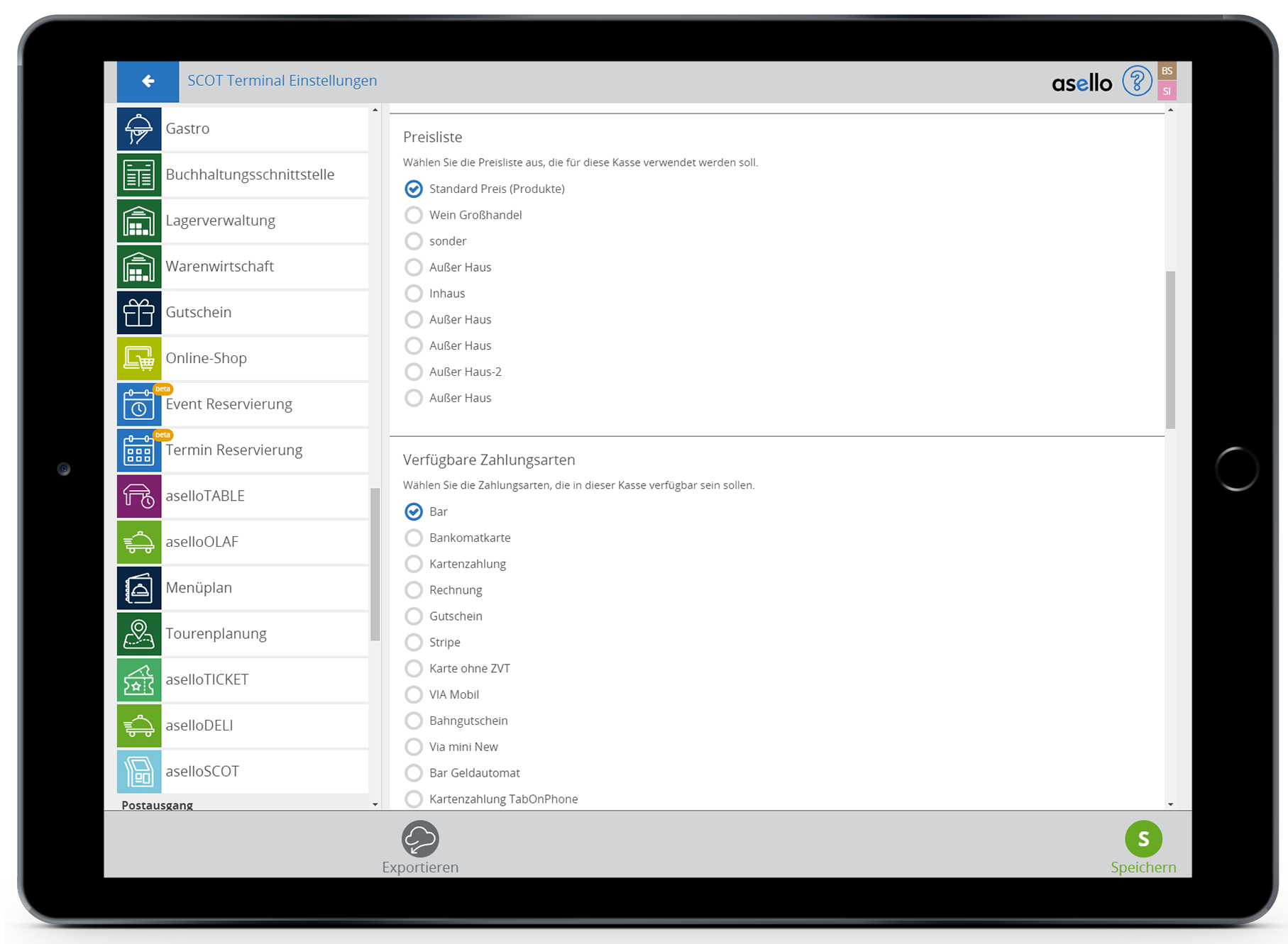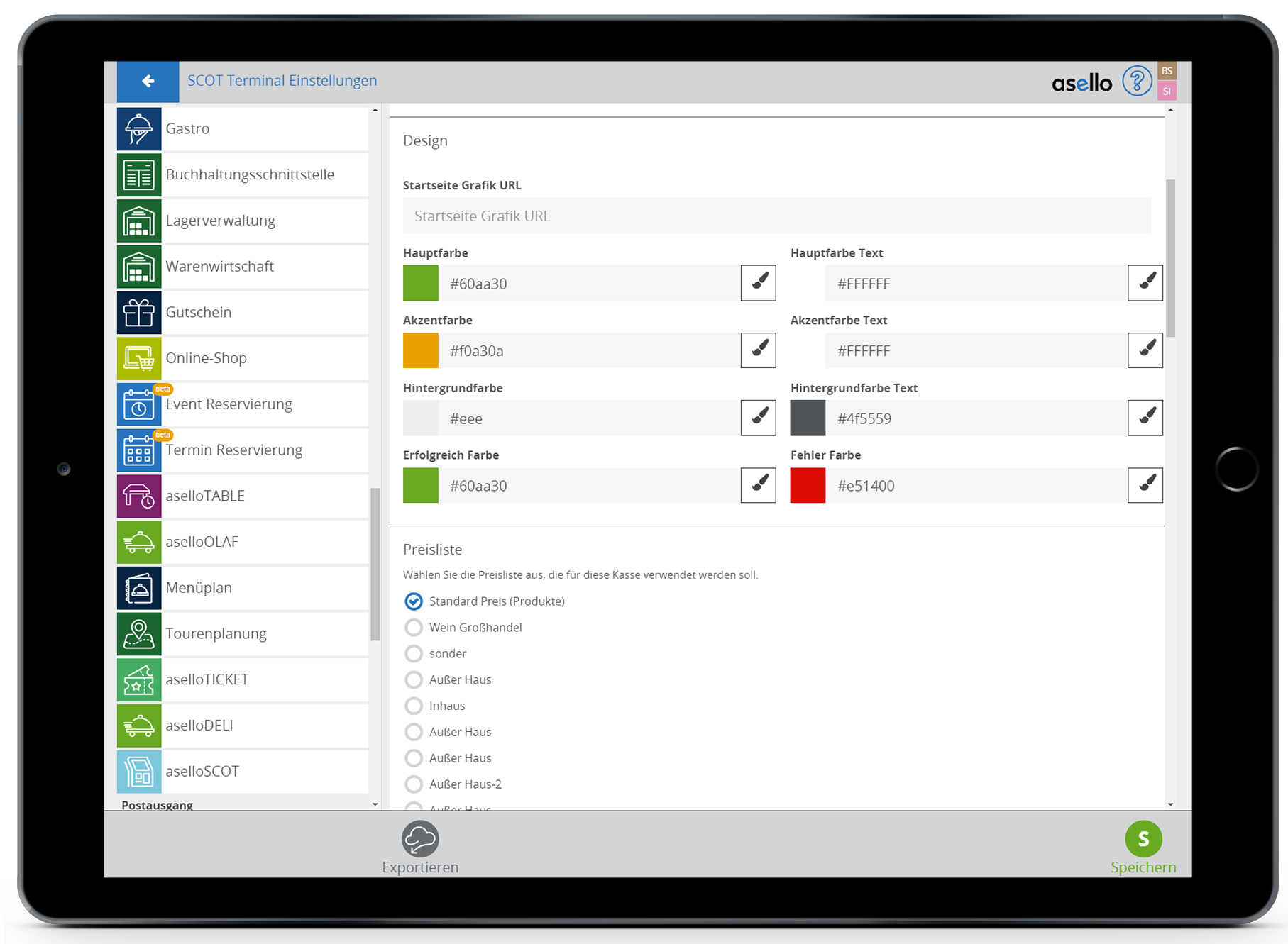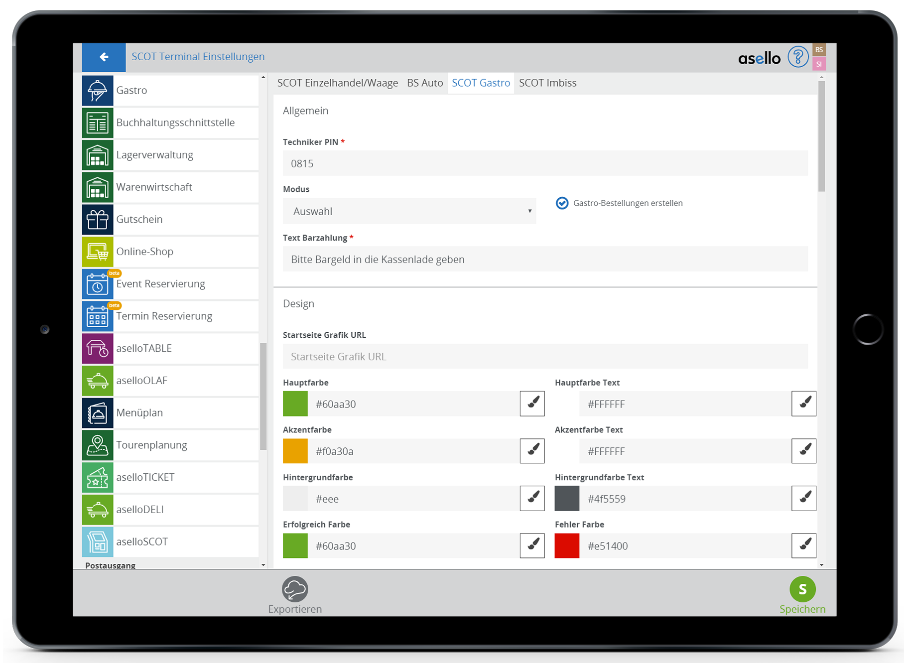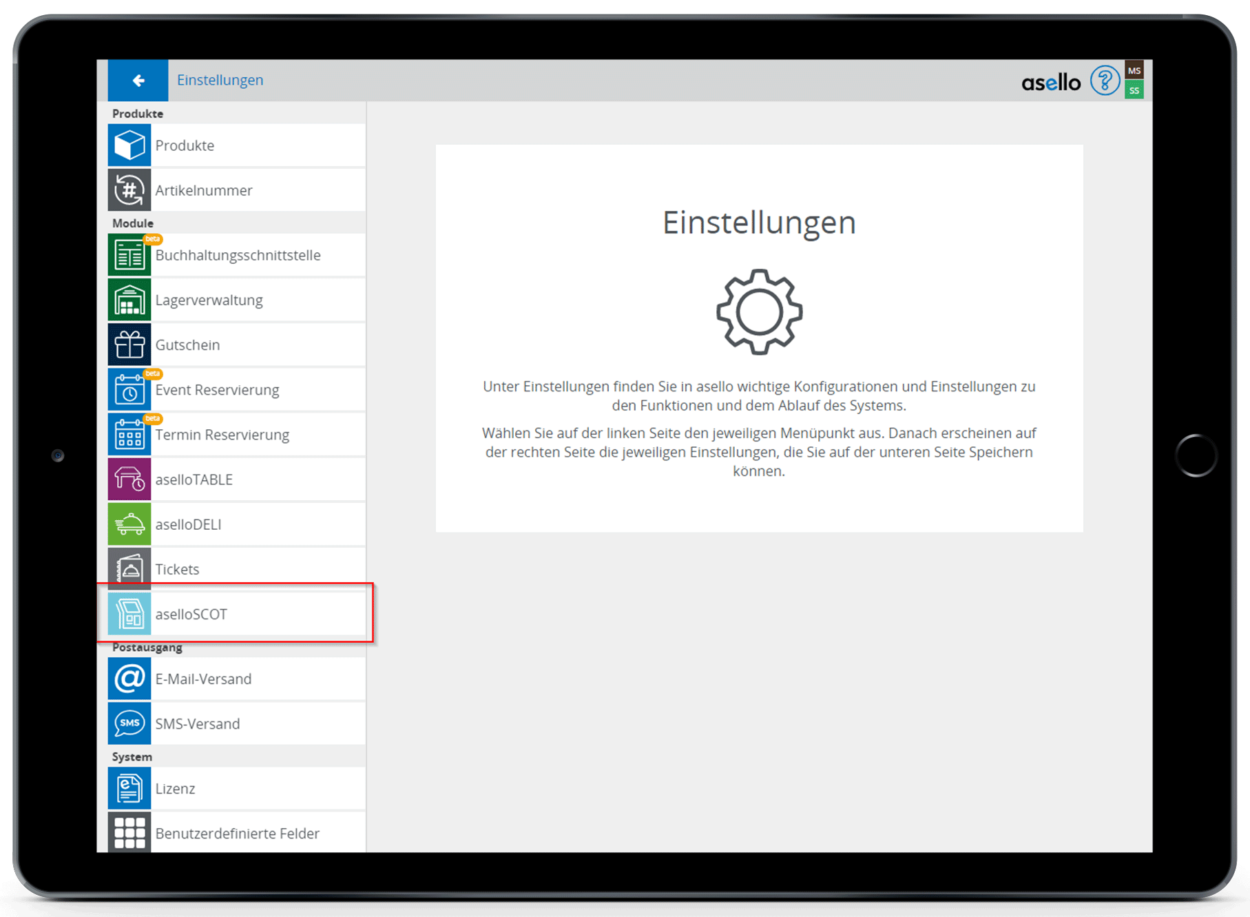 Die Konfiguration für das Terminal finden Sie in den Einstellungen im Abschnitt "Module". Klicken Sie auf den Menüpunkt "aselloSCOT".