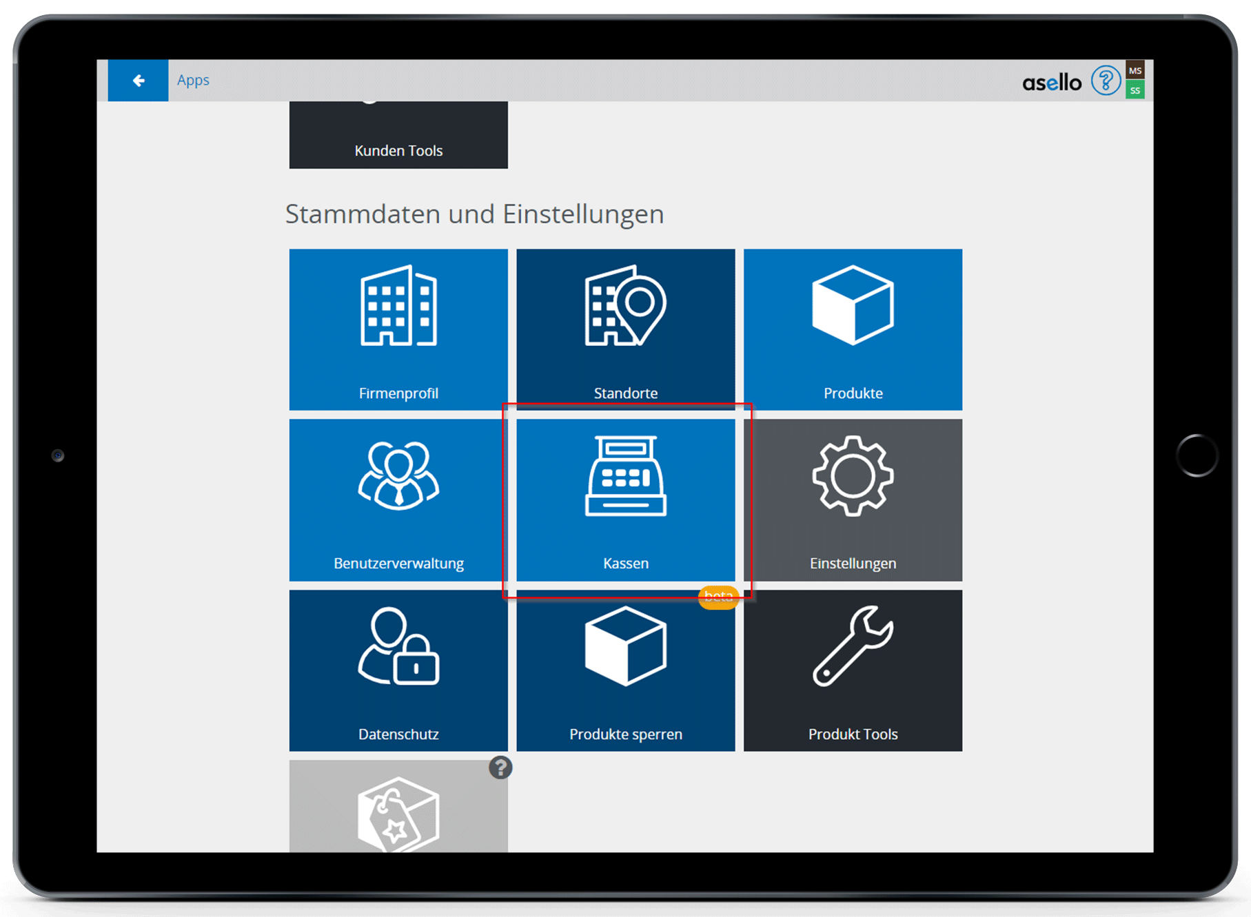 Ihr Self-Service-Terminal muss als eigene Kasse angelegt werden. Dafür öffnen Sie das App-Menü und klicken im Abschnitt "Stammdaten und Einstellungen" auf die Kachel "Kassen".