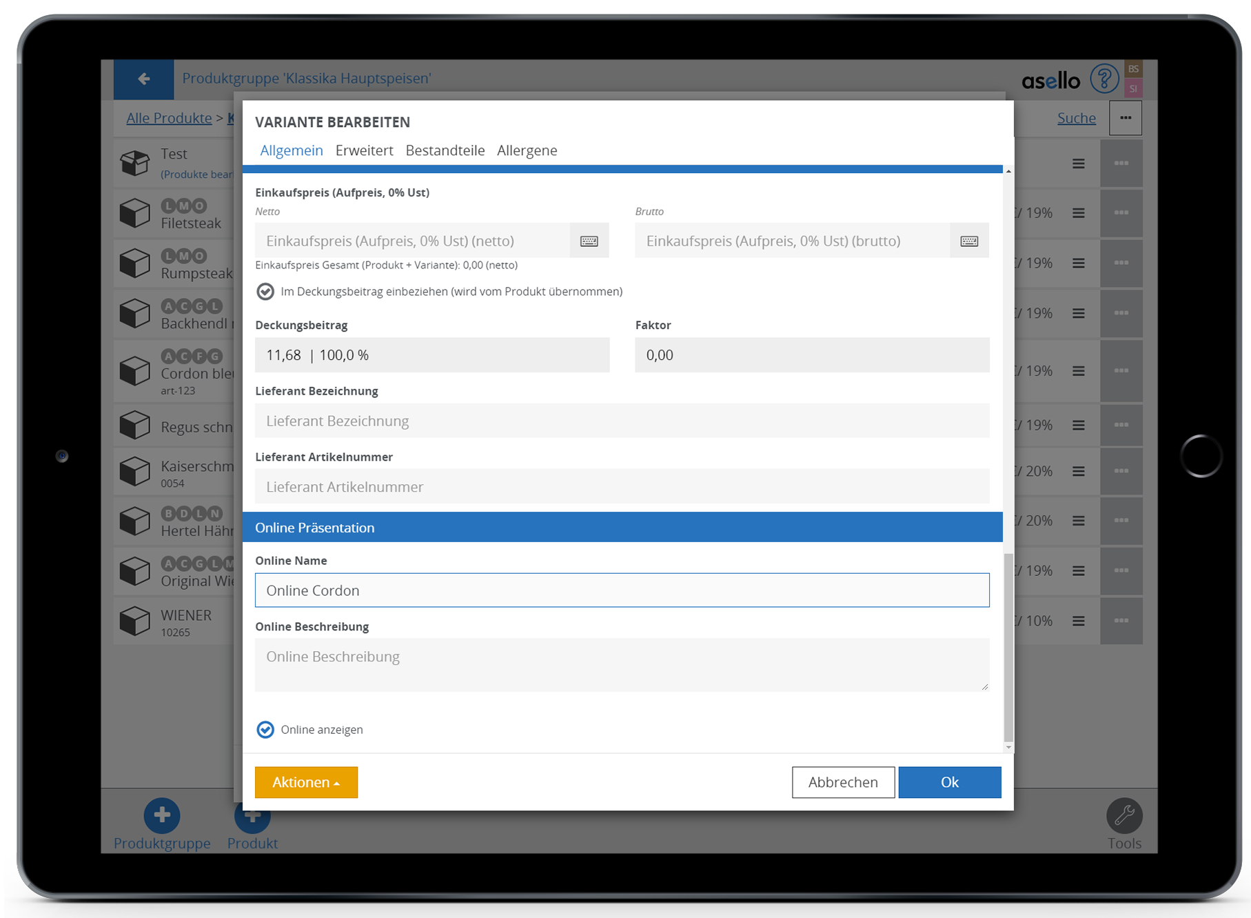 Bei einem Produkt mit Varianten und Optionen besteht die Möglichkeit für die einzelnen Varianten oder Optionen einen Online Namen zu definieren und die Auswahl ob diese Online oder nur in der Kasse angezeigt werden sollen zu treffen. Diese Einstellungen können jederzeit im Produkt geändert werden, oder beim Erstellen eines neuen Produktes definiert werden.