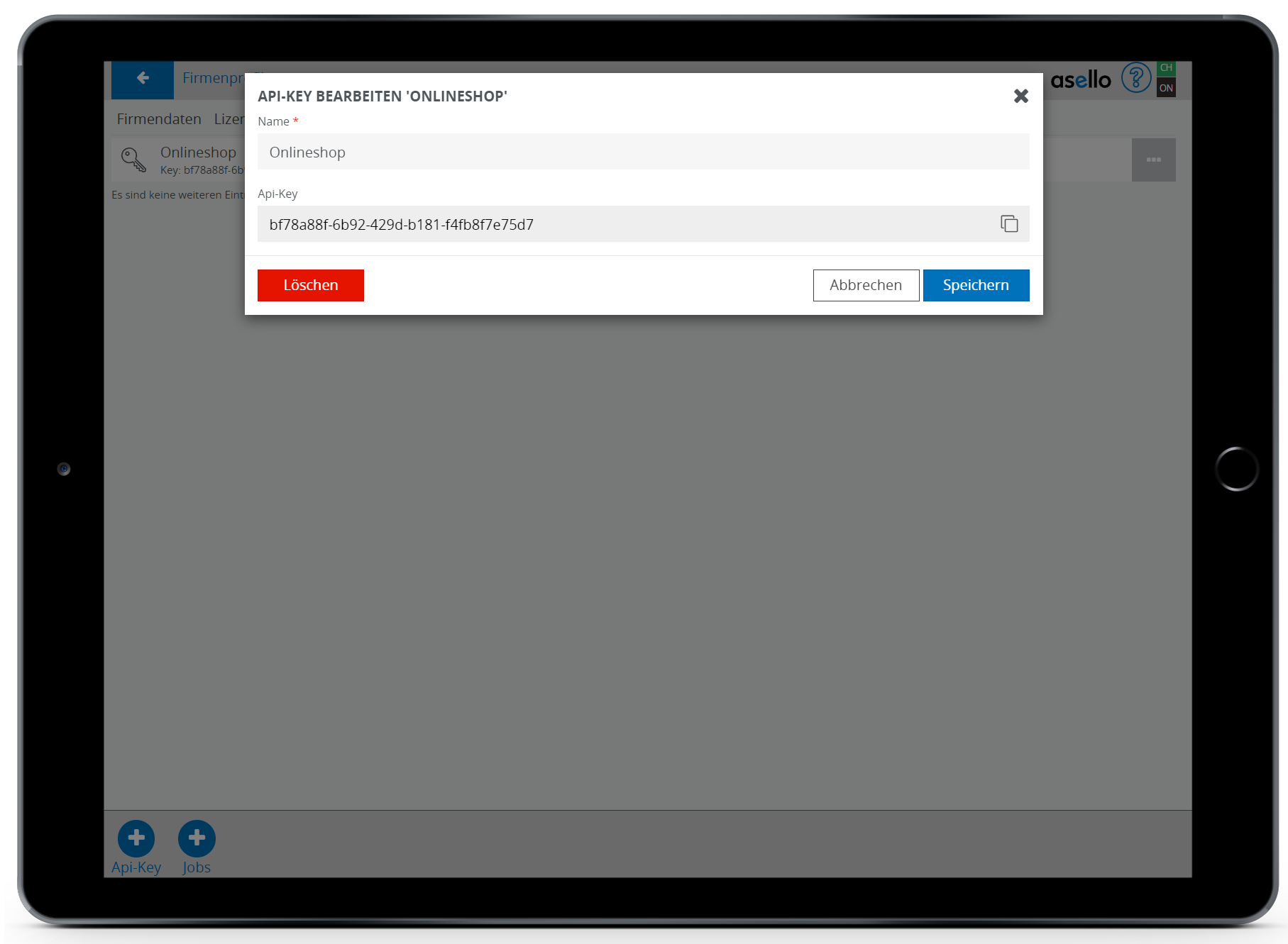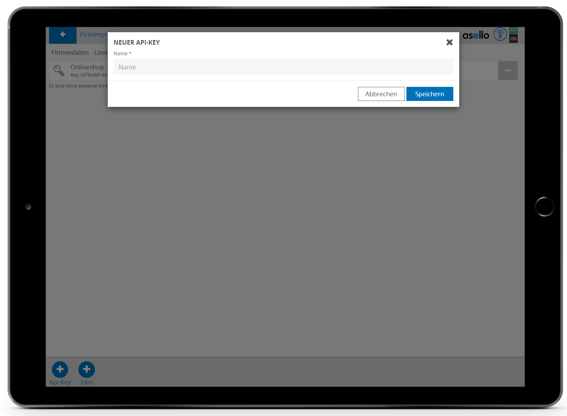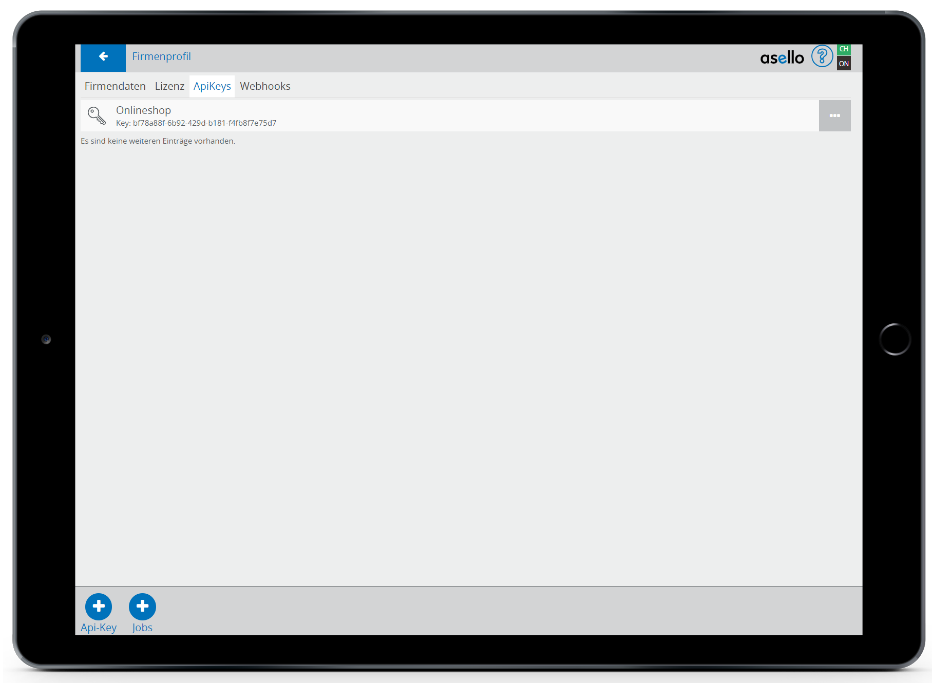 Zu diesem gelangen Sie, indem Sie die aselloPOS App starten und sich mit den Adminlogindaten einloggen. Anschließend klicken Sie auf die Kachel „Firmenprofil". Im Firmenprofil befindet sich der Reiter API Keys.