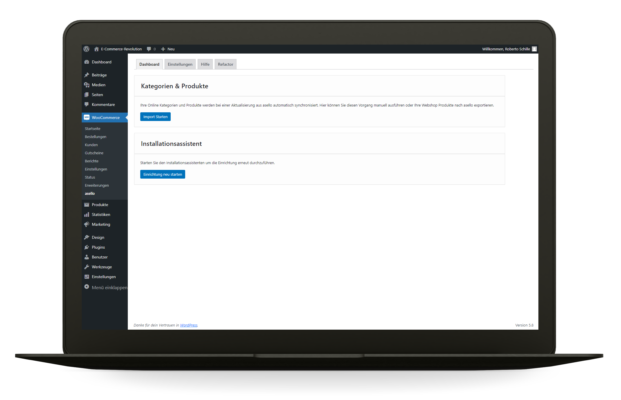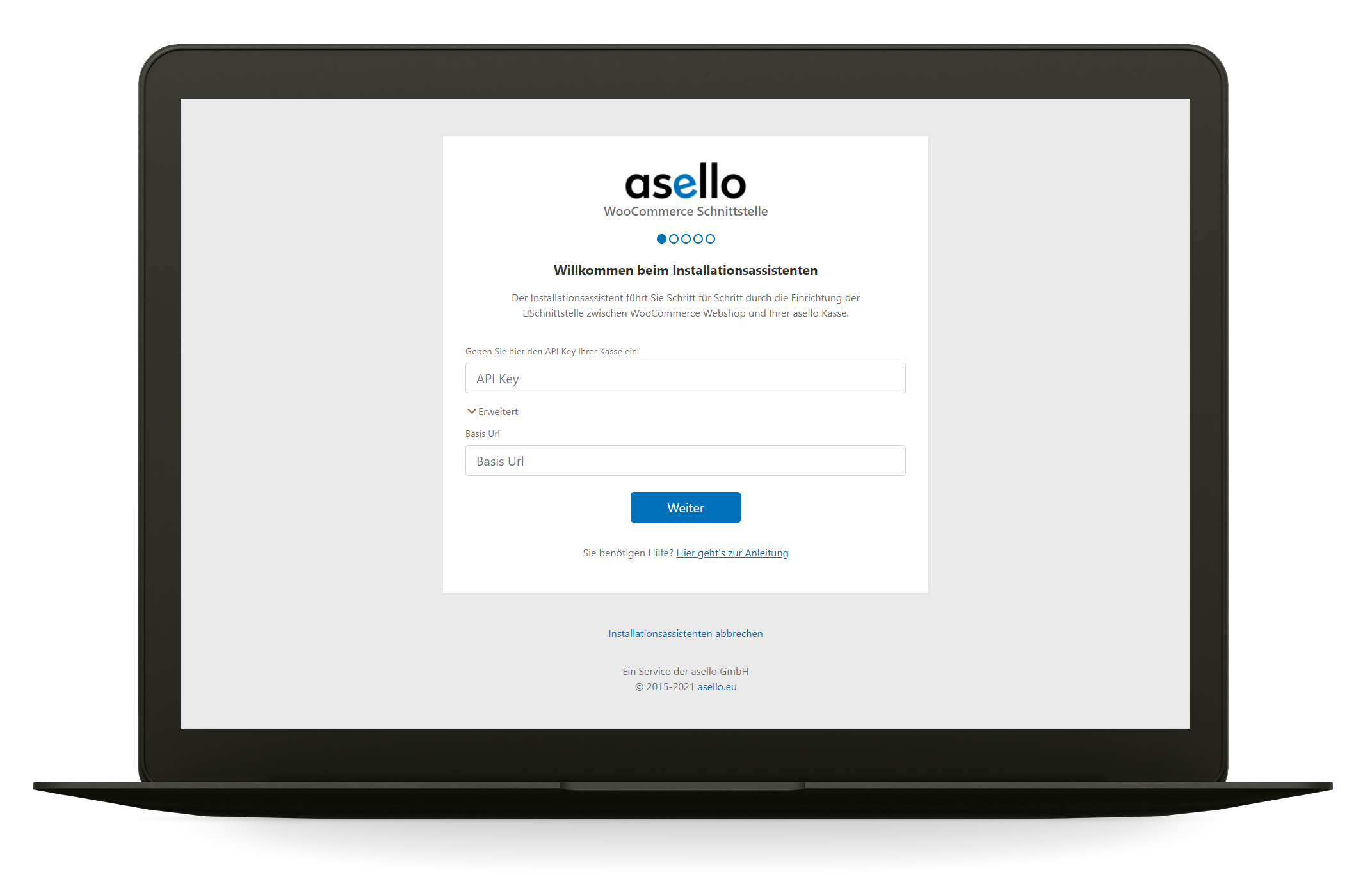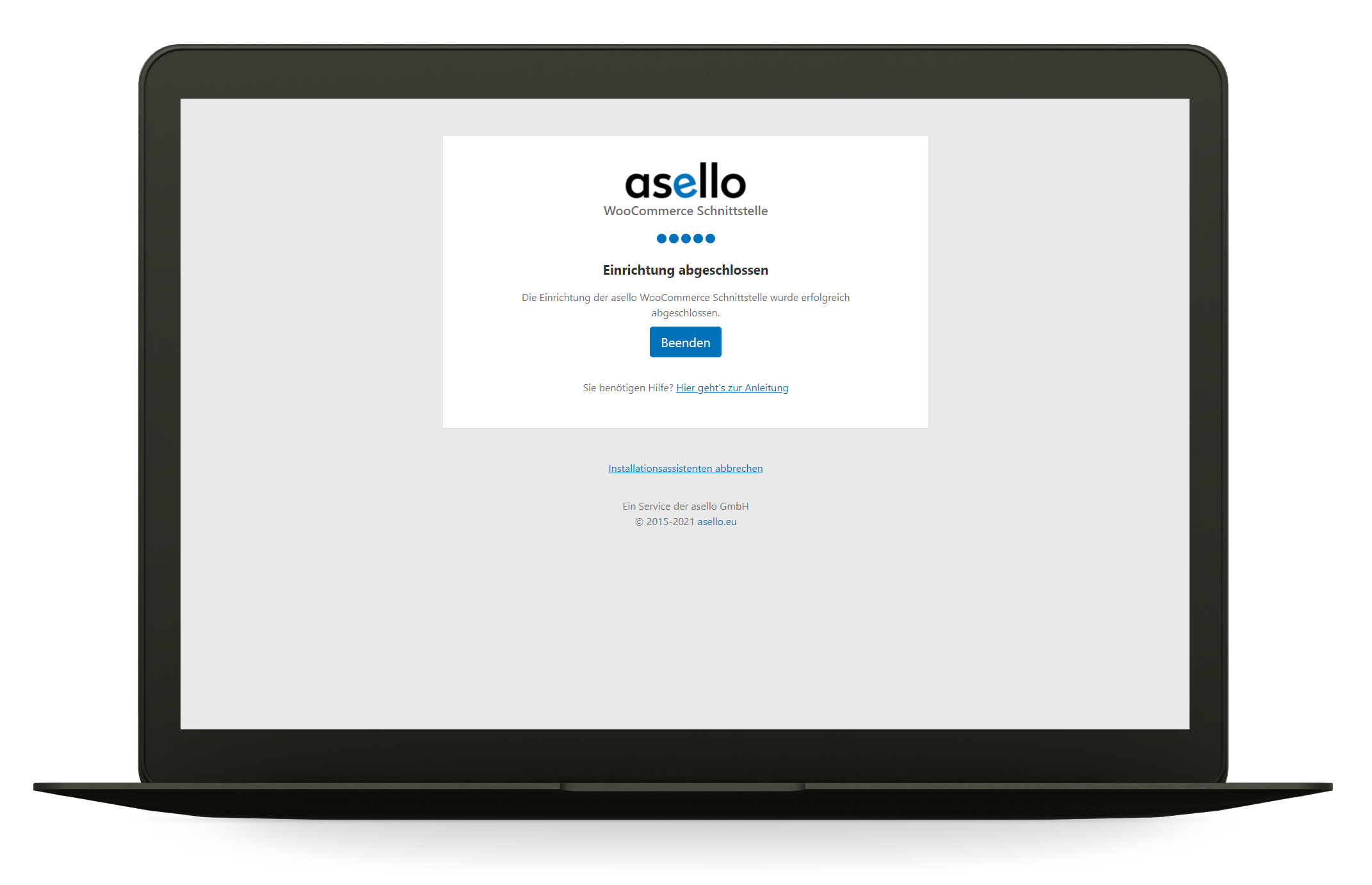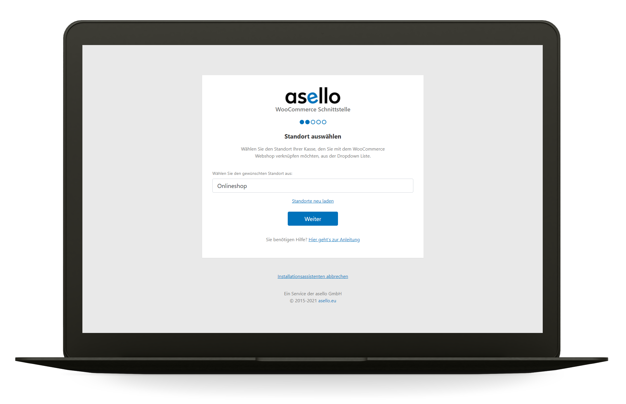 Zum Erstellen der Verbindung steht Ihnen ein Installationsassistent zur Verfügung. Um zu diesen zu gelangen, klicken Sie im Backend auf „WooCommerce" und anschließend auf die Unterseite „asello". Auf der rechten Seite erscheint nun ein Dashboard, indem Ihnen der Abschnitt „Installationsassistent" angezeigt wird. Um den Installationsassistenten zu starten, klicken Sie auf den blauen Button „Einrichtung neu starten“. Mit dem Installationsassistenten wird nun Schritt für Schritt die Einrichtung der Schnittstelle zwischen WooCommerce und Ihrer asello Kasse durchgeführt.