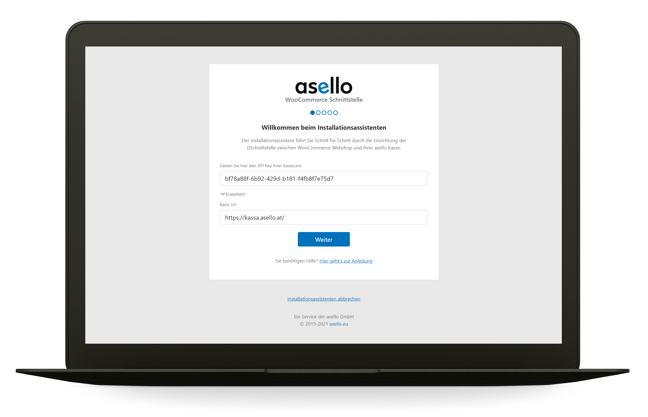 Unter „Erweitert" müssen Sie den Basis URL eintragen. Der Basis URL der eingetragen sein muss lautet: https://kassa.asello.at/