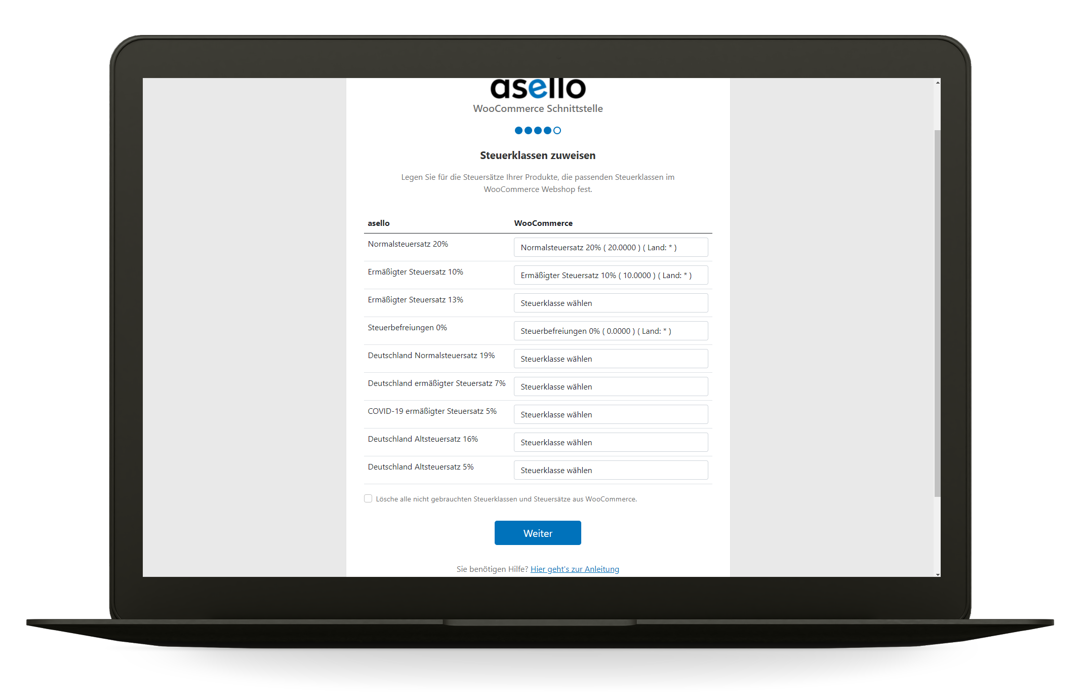 Im nächsten Schritt müssen Sie die für die Steuersätze Ihrer Produkte, die passenden Steuerklassen im WooCommerce Webshop festlegen. Klicken Sie dazu in der jeweiligen Zeile auf das Feld in der Spalte WooCommerce und wählen die Steuerklasse aus.
