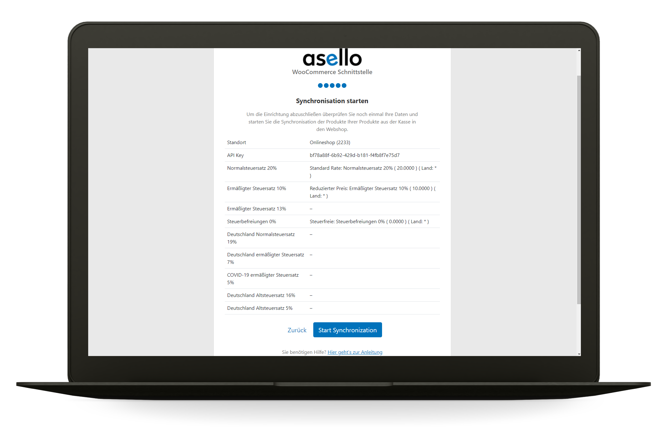 Um die Einrichtung abzuschließen, überprüfen Sie noch einmal Ihre Daten und starten Sie die Synchronisation der Produkte Ihrer Produkte aus der Kasse in den Webshop.