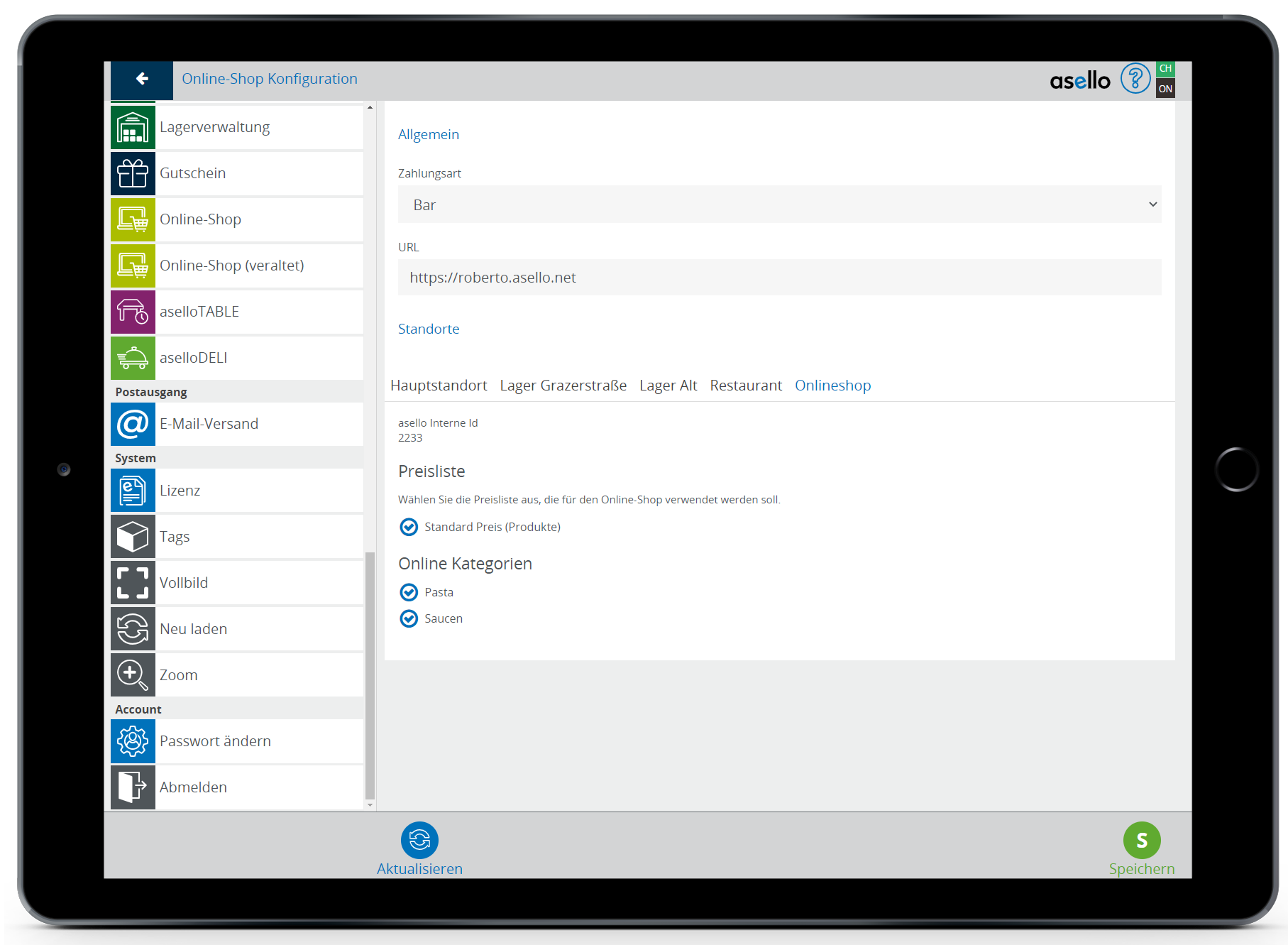 Online Kategorien, die hier nicht aktiviert wurden, werden im Onlineshop nicht angezeigt.