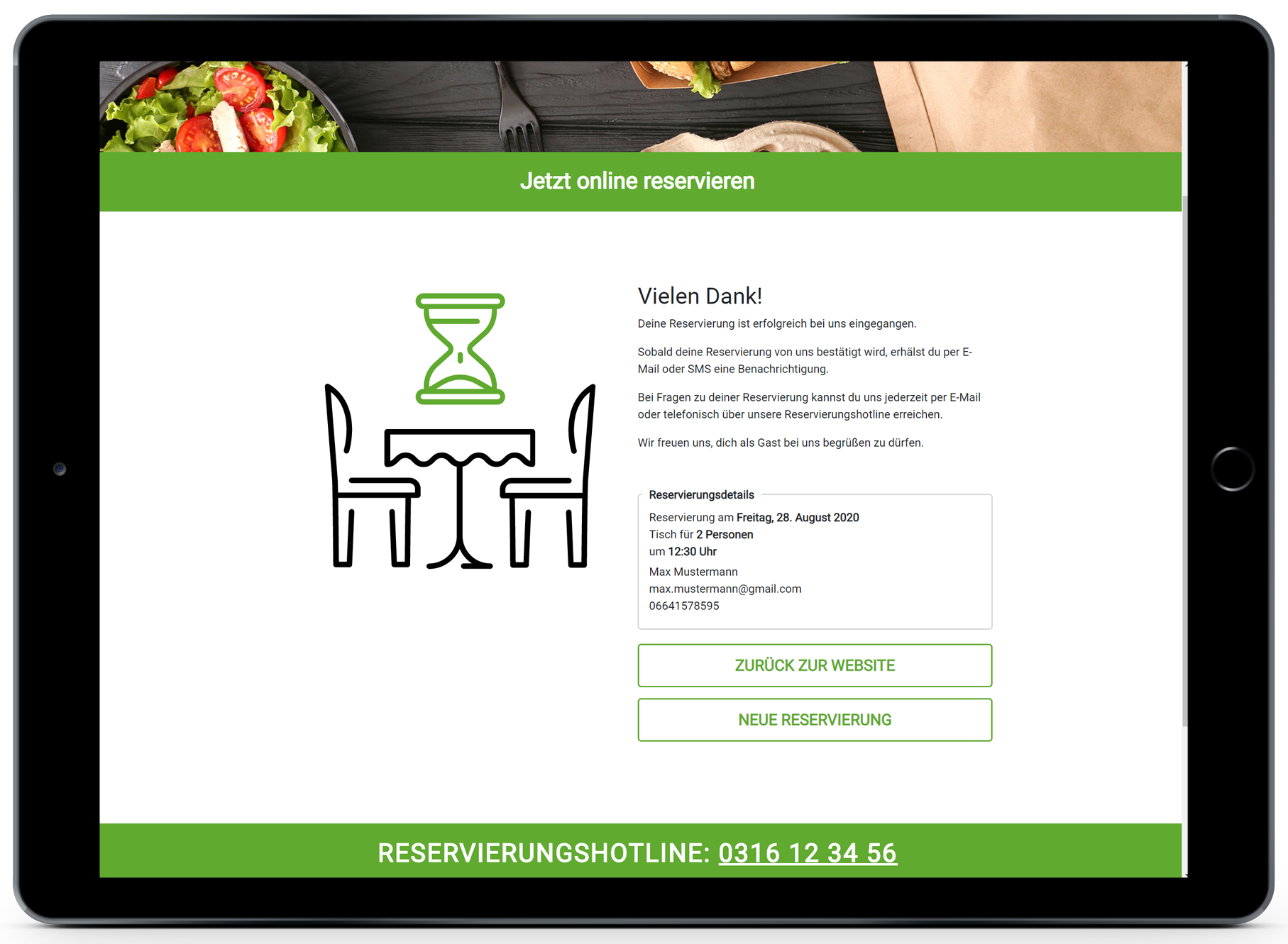 Eine Onlinereservierung muss erst bestätigt werden, weshalb Ihren Kunden als letztes ein Fenster angezeigt wird, indem darauf hingewiesen wird. Über die Bestätigung oder Ablehnung der Reservierung wird der Kunde per E-Mail oder SMS verständigt.