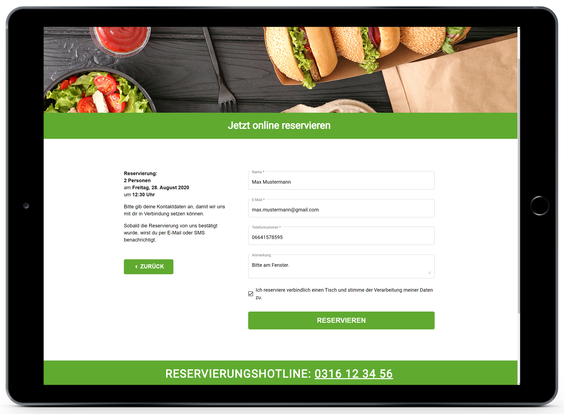 Im letzten Schritt muss der Kunde seinen Namen, E-Mail-Adresse und Telefonnummer angeben und ein Häkchen bei „Ich reserviere verbindlich einen Tisch und stimme der Verarbeitung meiner Daten zu." setzten. Optional kann noch eine Anmerkung hinzugefügt werden. Die Reservierung wird abschließend mit einem klick auf den Button „Reservieren" durchgeführt.