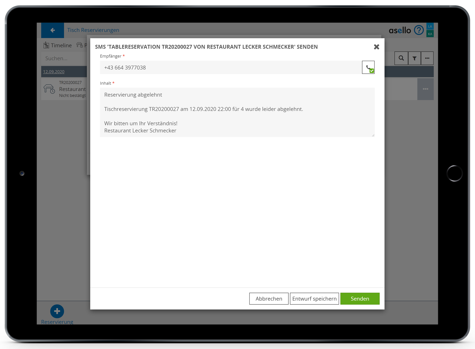 Haben Sie „E-Mail/SMS Vorschau anzeigen" aktiviert, erscheint noch ein Pop-Up-Fenster mit einer Vorschau der Bestätigung. Damit die Bestätigung versendet wird, klicken Sie auf den grünen Button „Senden".