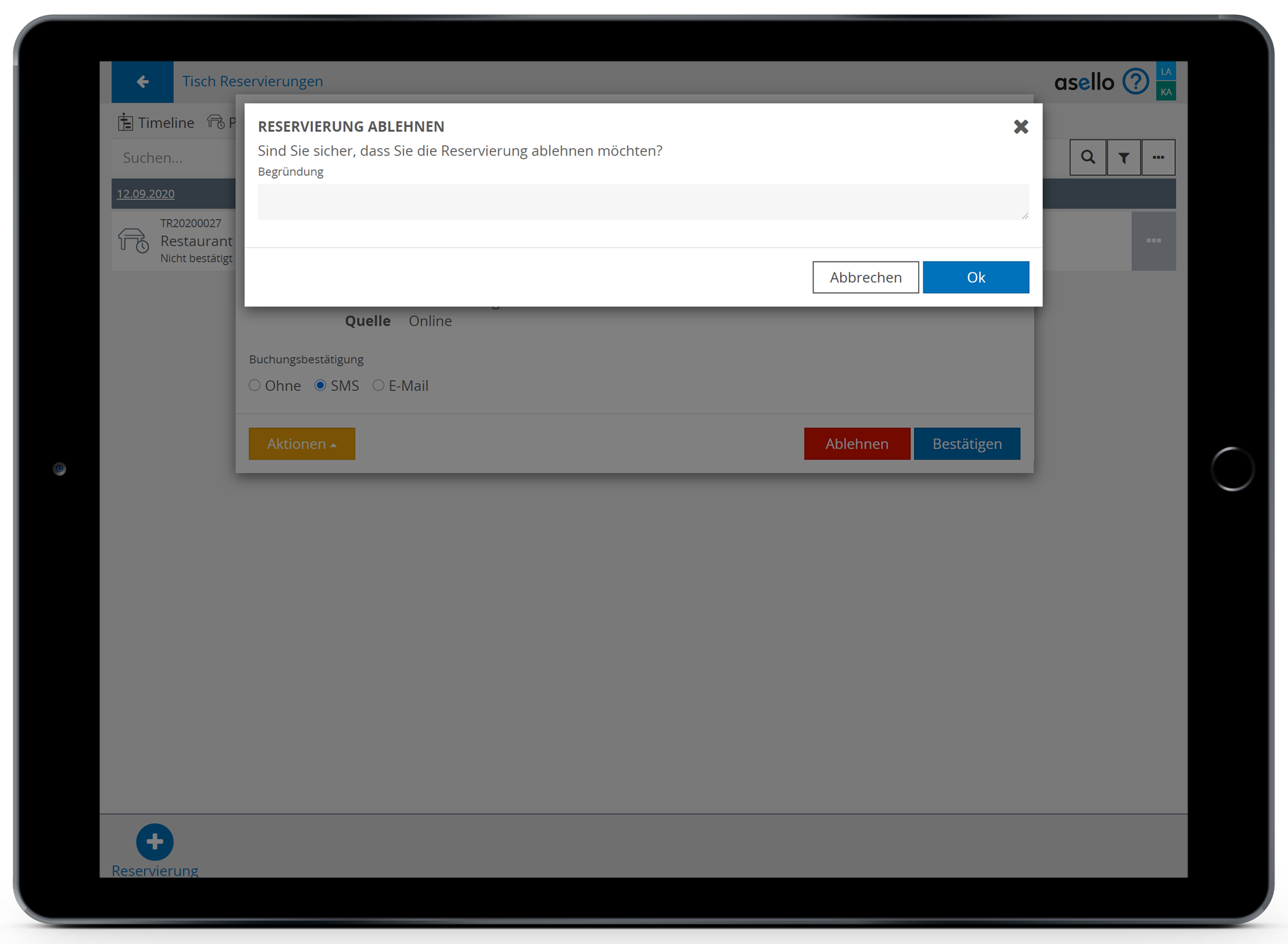 Wird eine Onlinereservierung abgelehnt muss zusätzlich in einem Pop-Up-Fenster eine Begründung eingetragen werden.