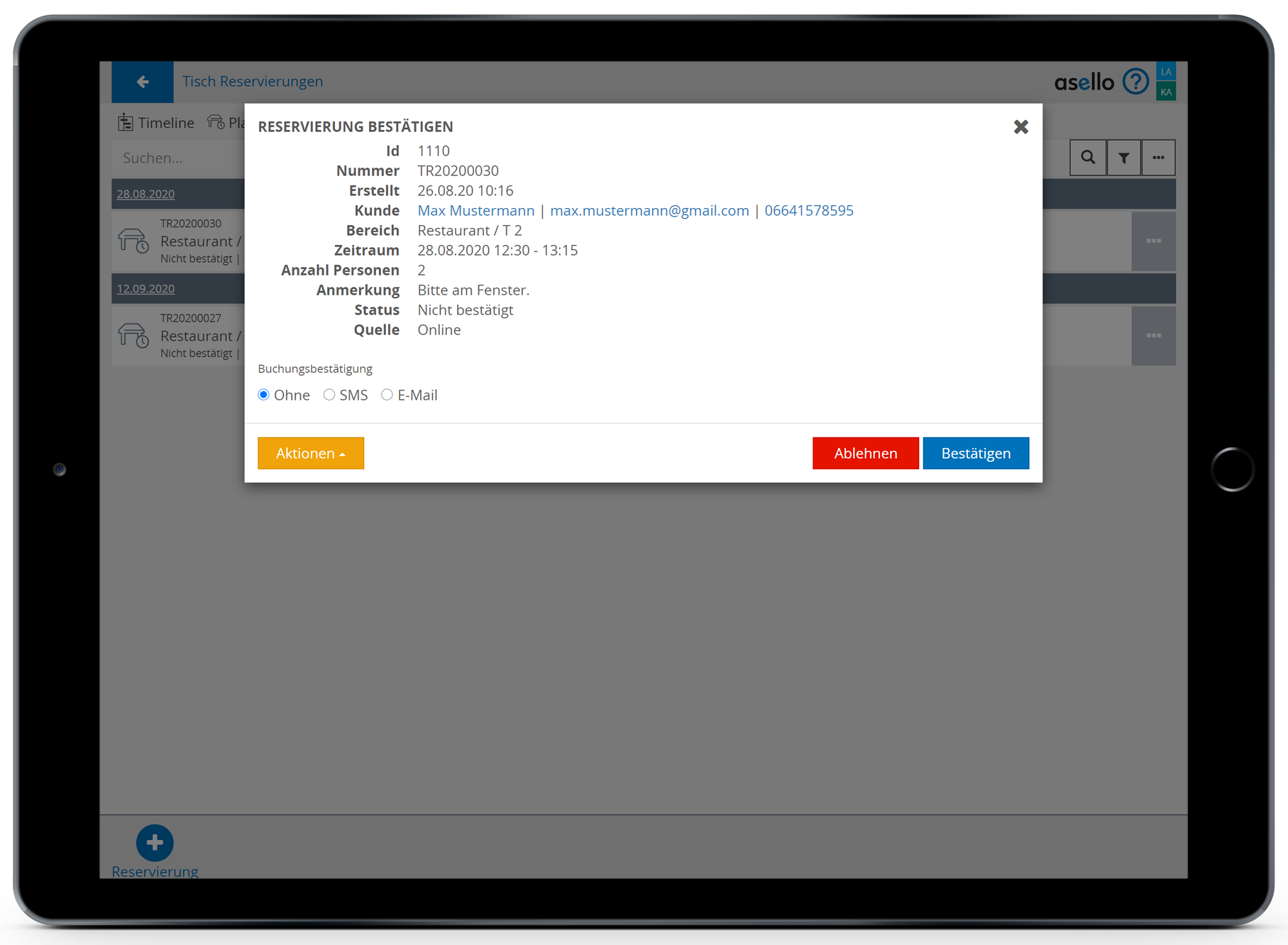 Unter Buchungsbestätigung können Sie auswählen, wie der Kunde benachrichtigt werden soll. Auf der rechten Seite befinden sich der rote Button „Ablehnen" und der blaue Button „Bestätigen". Nachdem einer der Buttons betätigt wurde, wird der Status der Reservierung auf abgelehnt oder bestätigt gestellt.