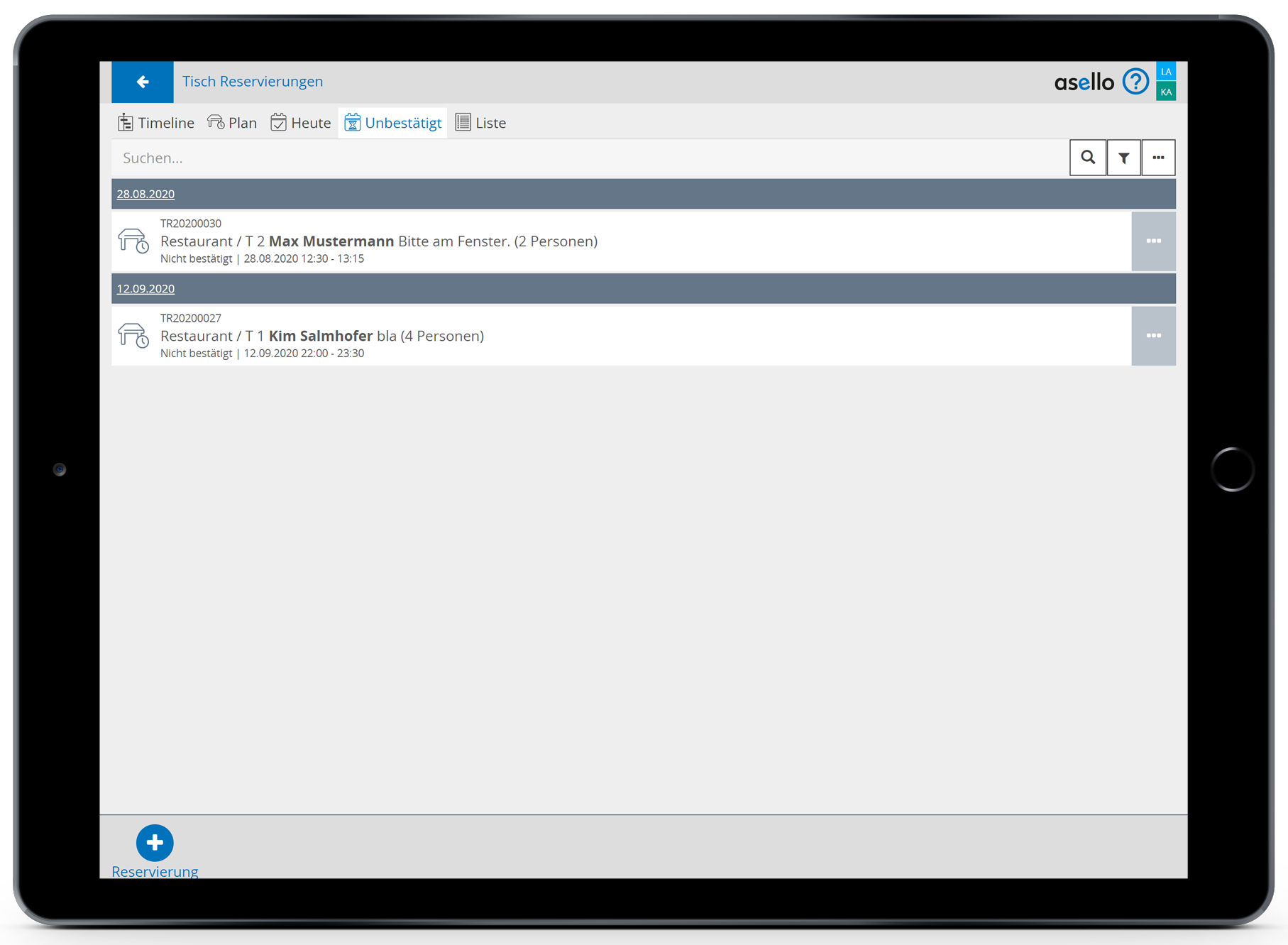 Eine Onlinereservierung die weder bestätigt noch abgelehnt wurde hat in aselloTABLE den Status „Unbestätigt". Unbestätigte Onlinereservierungen können Sie in der Kachel „Tisch Reservierungen" im Reiter "Unbestätigt" abrufen.