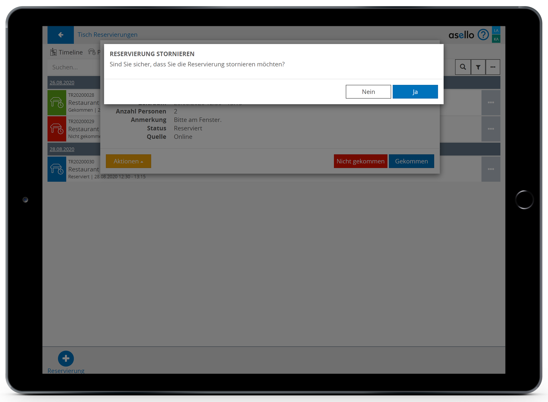 Nachdem Sie dies mit einem Klick auf den blauen Button „Ja" bestätigt haben, wird die Reservierung in der Liste grau angezeigt. Im Infofenster der Reservierung hat diese nun den Status „Storniert".