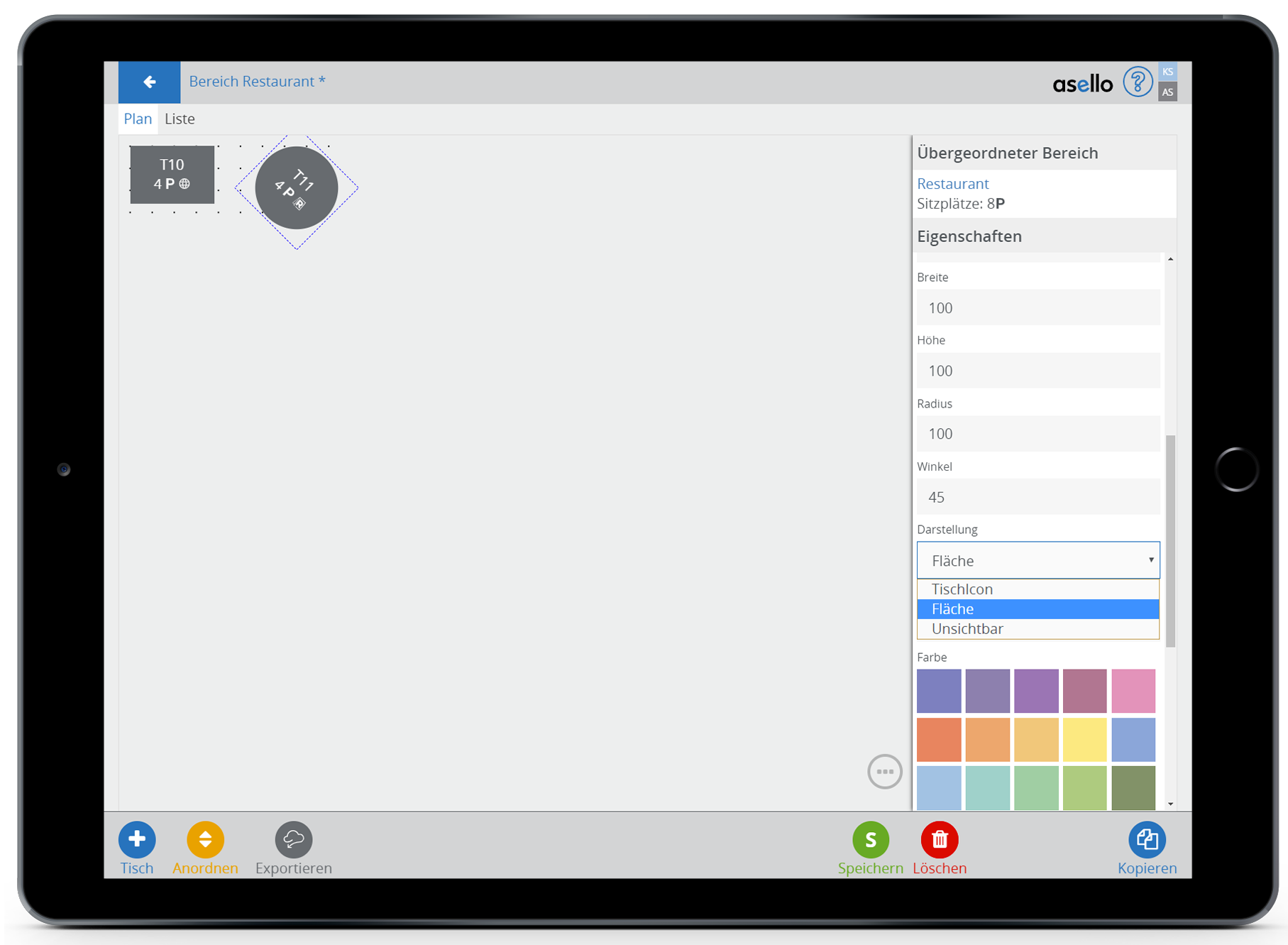 Zuletzt können Sie noch dem Tisch eine individuelle Farbe geben. Wählen Sie dafür die gewünschte Farbe aus, oder geben Sie den Farbcode der gewünschten Farbe ein.