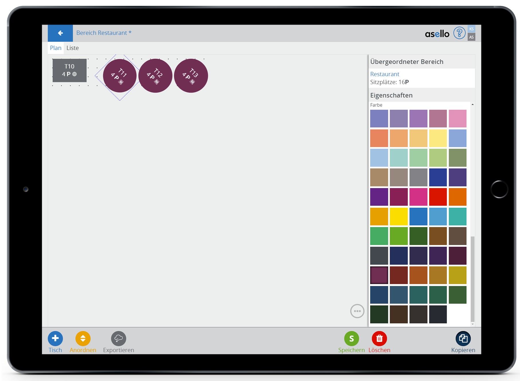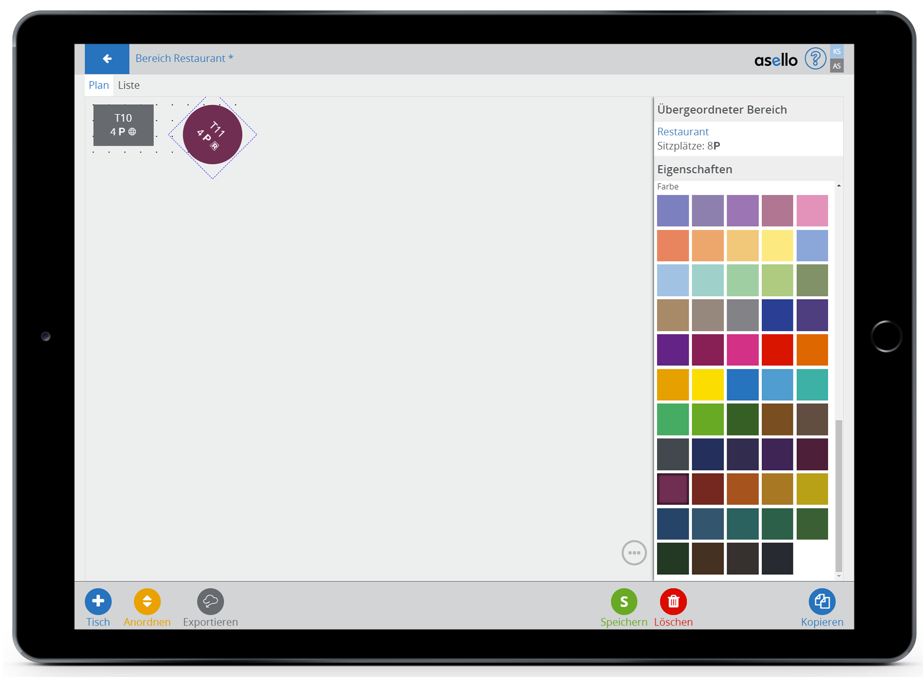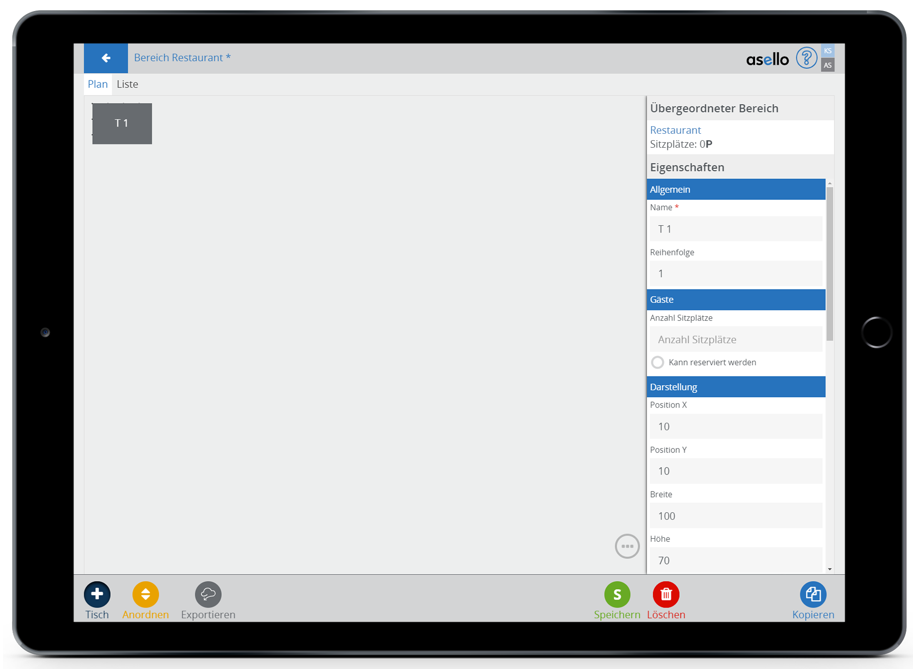 Haben Sie sich so einen Tisch konfiguriert und möchten einen zweiten Tisch mit denselben Konfigurationen, so klicken Sie auf den Tisch und anschließend auf den blauen Button „Kopieren“ im rechten unteren Eck. Dadurch wird der Tisch kopiert und automatisch der Name des Tisches fortlaufend gestaltet.