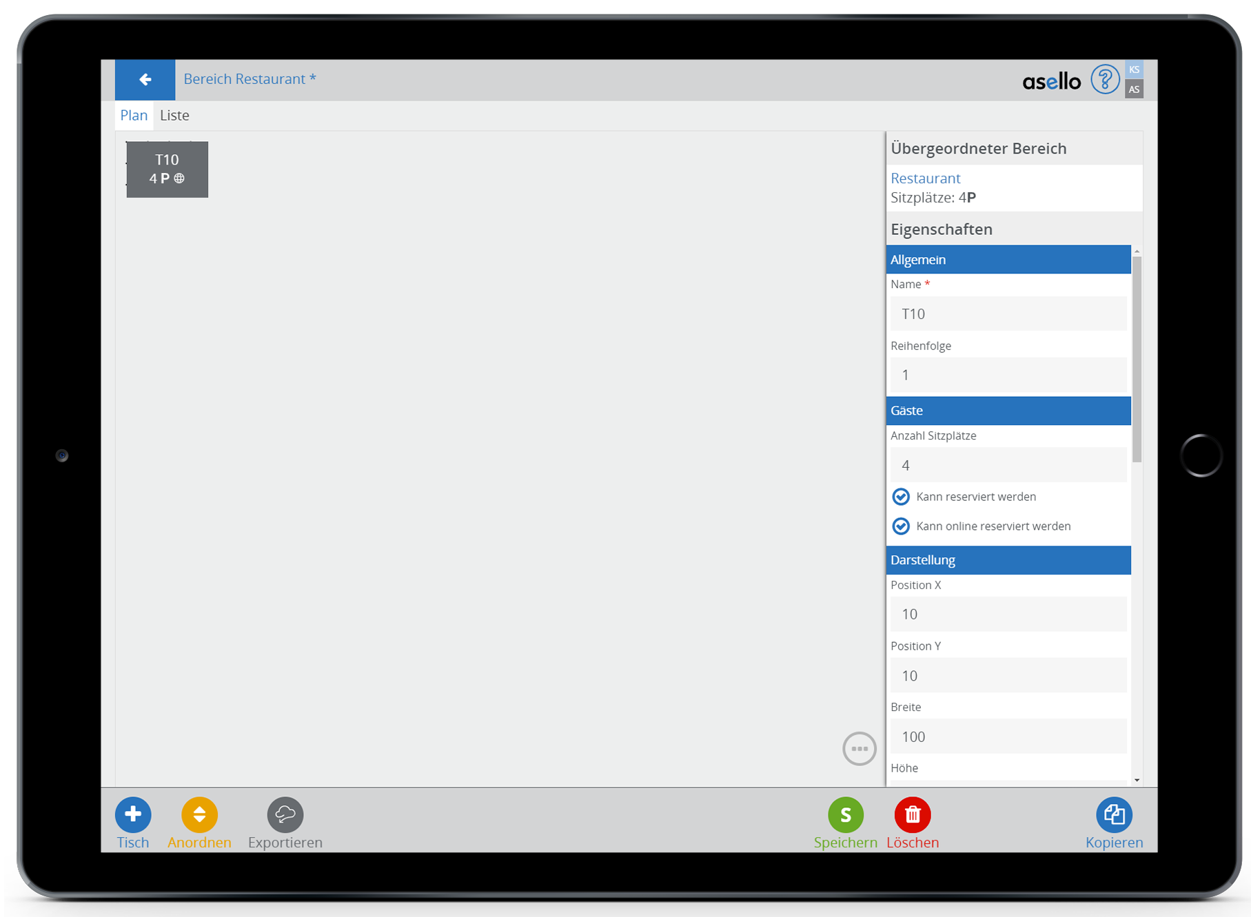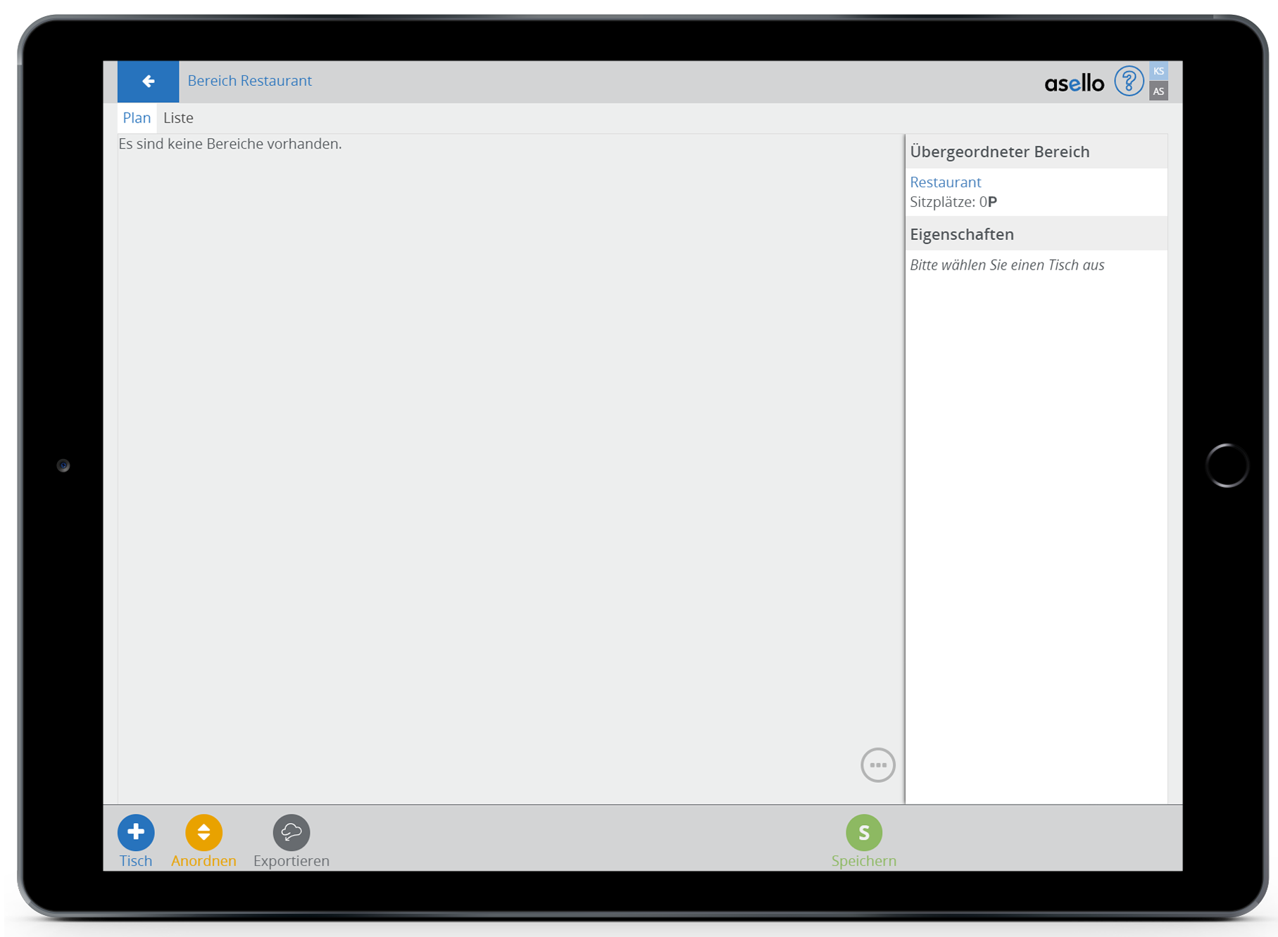 Um den erstellten Tischplan für den Bereich zu speichern, klicken Sie auf den grünen Button „Speichern“ auf der rechten unteren Seite.