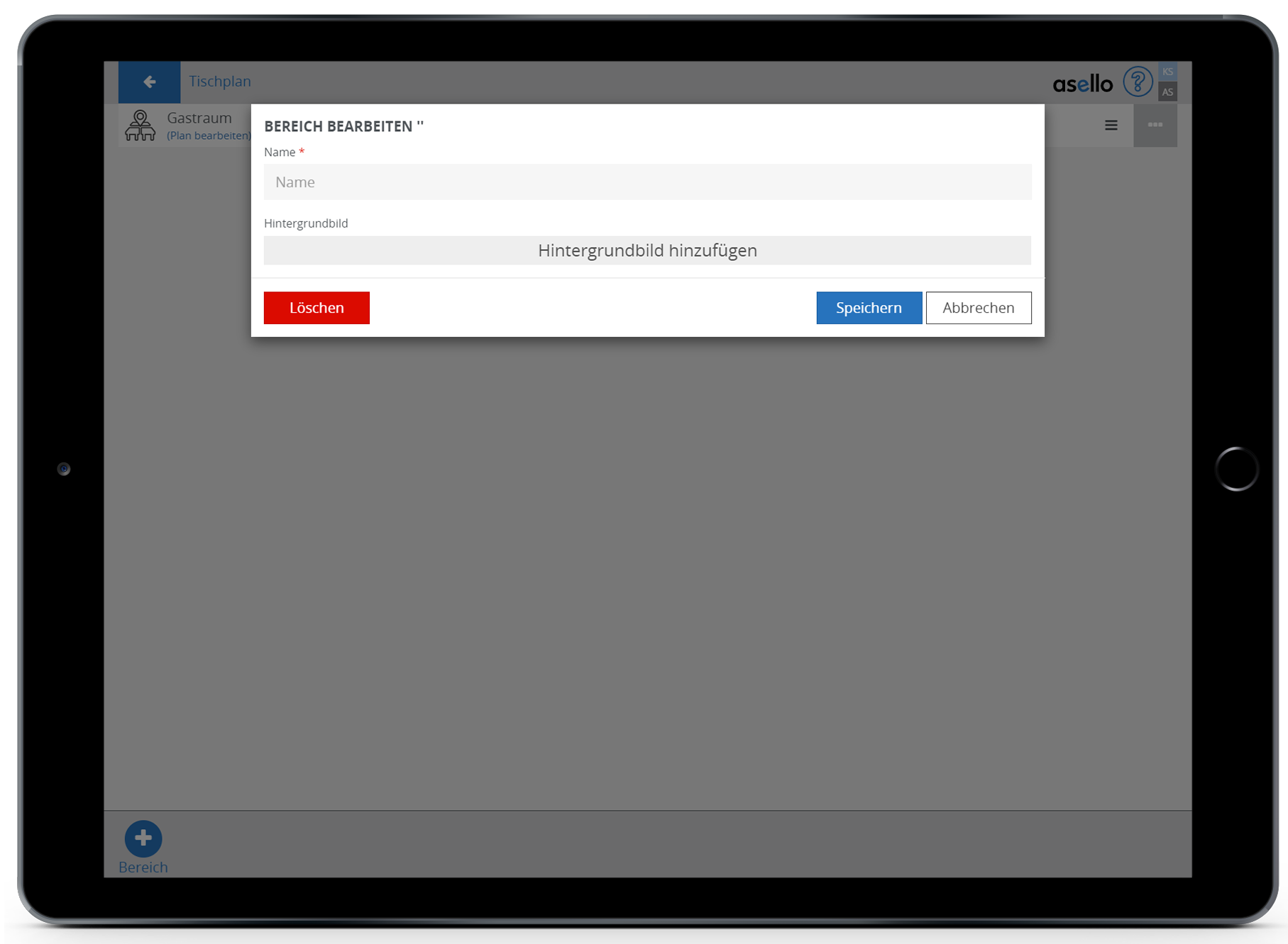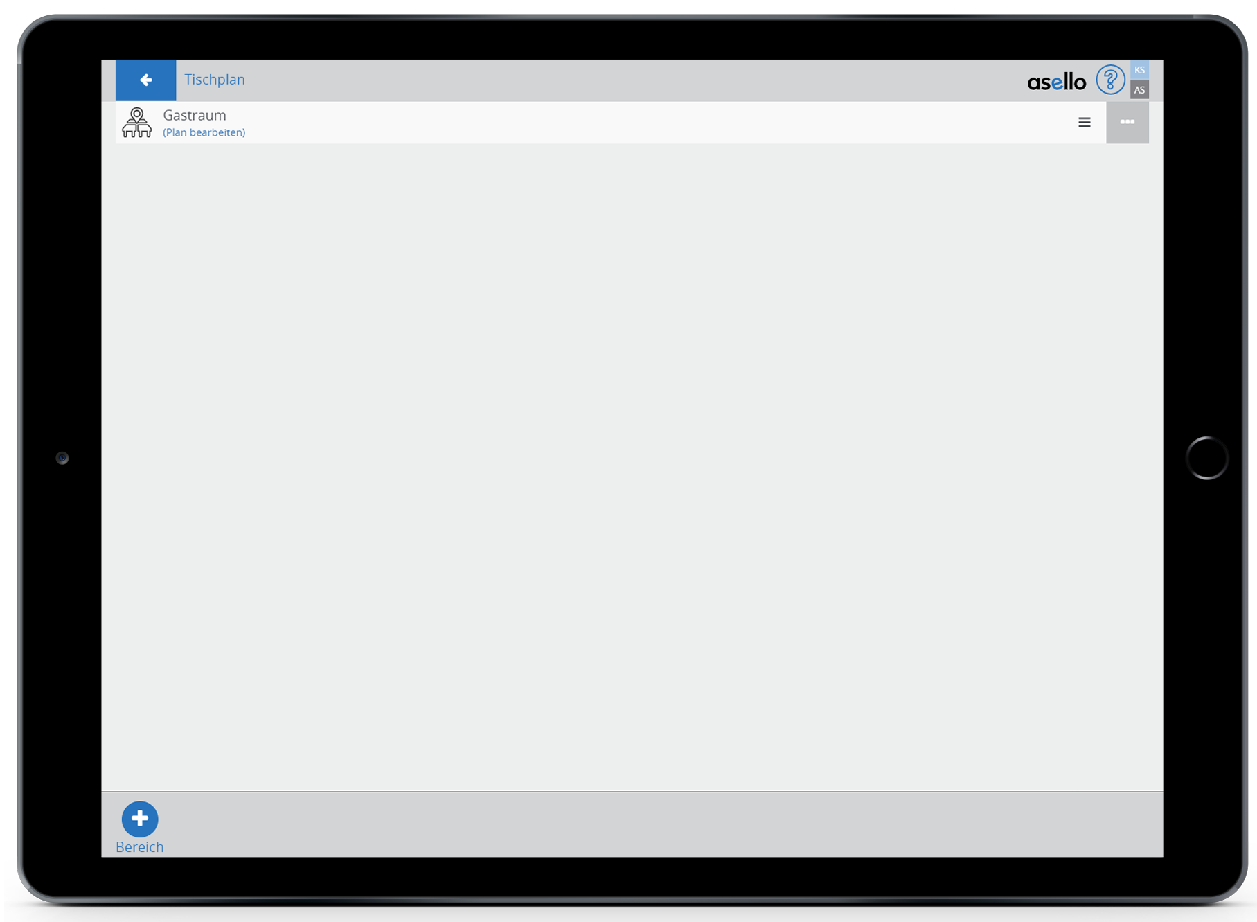 Bereiche dienen dazu, Ihr Lokal übersichtlicher zu gestalten. So können Sie Tischpläne für die Bar und für das Restaurant getrennt erstellen. Zuerst müssen Sie einen Bereich erstellen. Dazu klicken Sie auf das blaue Plus „Bereiche“ im linken unteren Eck. In diesem Fall nennen wir den Bereich Restaurant. Um den Bereich abschließend zu erstellen, klicken Sie auf den blauen Button „OK“. Um einen Bereich umzubenennen oder zu löschen, klicken Sie auf das graue Viereck mit den drei weißen Punkten am Ende der jeweiligen Zeile. Die Reihenfolge der Bereiche können Sie ändern, indem Sie auf die drei grauen Striche am Ende der jeweiligen Zeile drücken und den Bereich an die gewünschte Stelle ziehen.