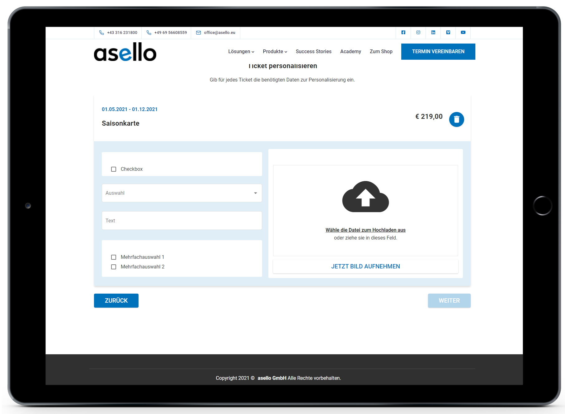 Wurden für ein Ticket keine zusätzlichen Daten definiert, erscheint sofort Schritt 3 Kontaktdaten.