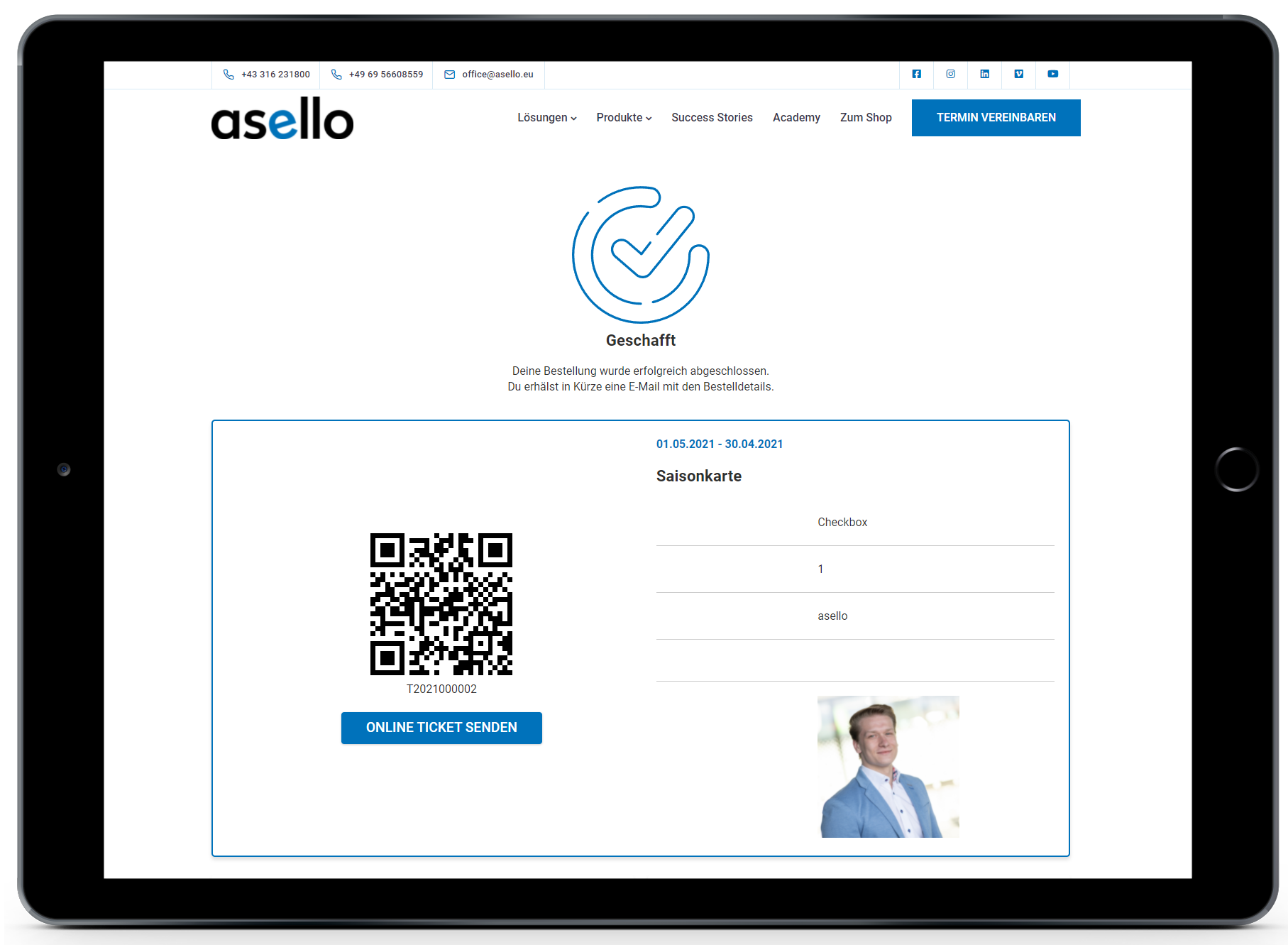 Als letzter Schritt wird „Fertig" angezeigt. In diesem wird angezeigt, ob die Bestellung erfolgreich abgeschlossen wurde. Es werden des Weiteren die bestellten Tickets, die Zahlungsdaten und die Kontaktdaten angezeigt. Bei einem digitalen Ticket wird ein QR-Code angezeigt, mit welchem das Ticket eingelöst werden kann. Dieser wird auch automatisch an die E-Mail-Adresse gesendet, die bei den Kontaktinformationen angegeben wurde. Um diese Seite zu drucken, klicken Sie auf den Button „Seite Drucken“.