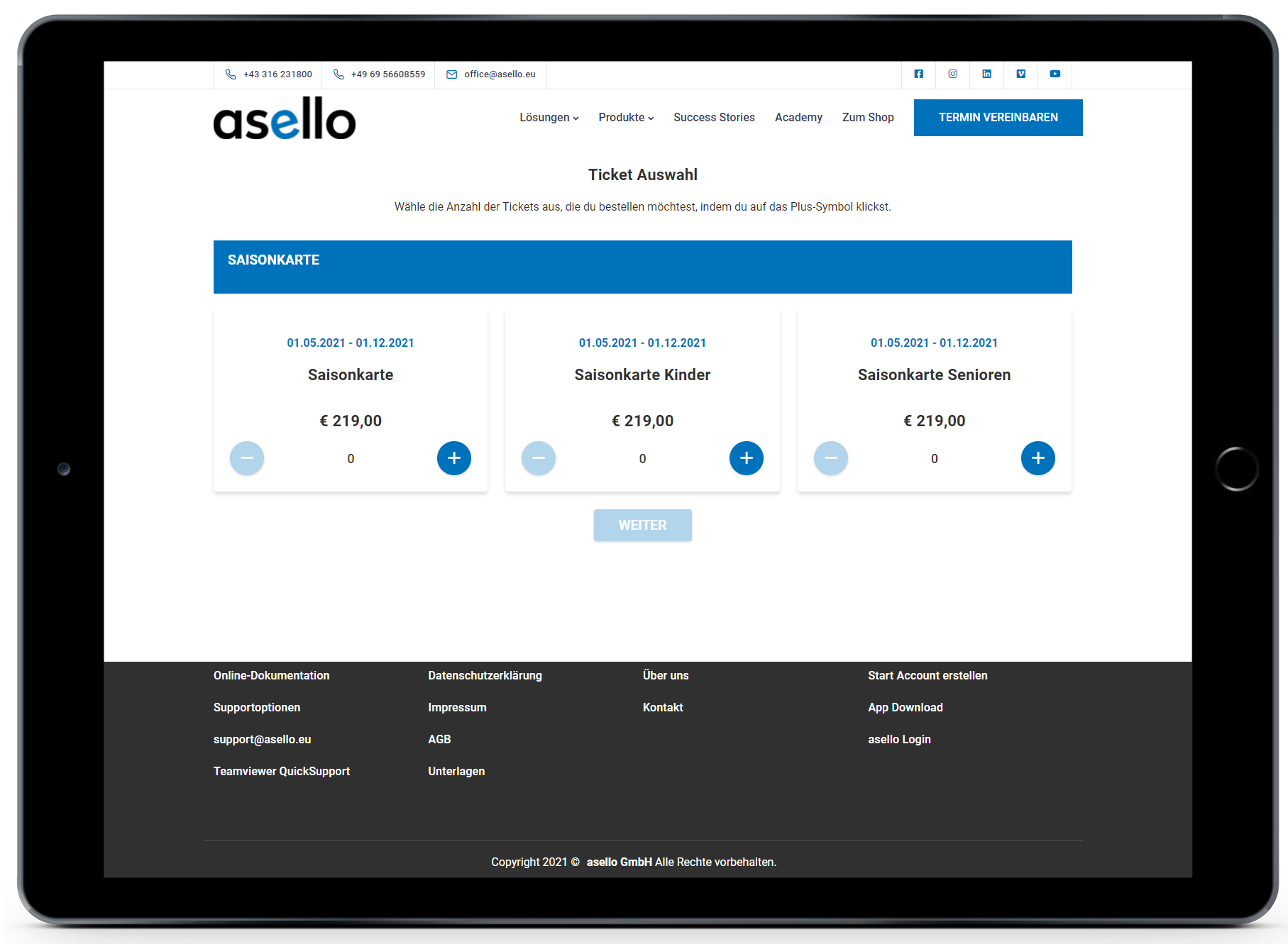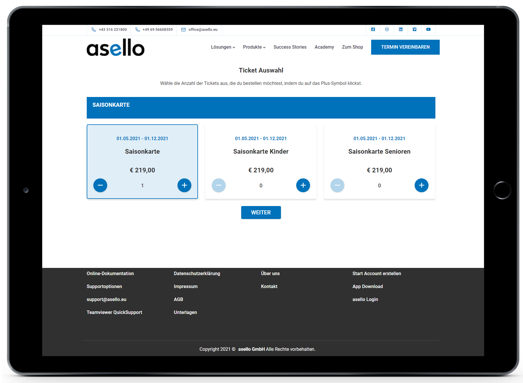 Wurde die gewünschte Bestellung ausgewählt, klicken Sie auf den Button „Weiter", welcher unter jeder Ticket-Kategorie erscheint.