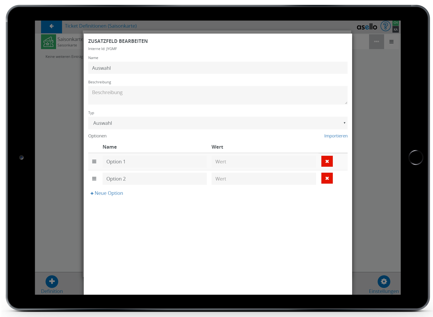 Mit dem Feld Auswahl wird beim Kauf eines Tickets im Unterpunkt Anpassung ein Dropdown Feld angezeigt und der Kunde muss eine dieser Optionen wählen. Eine Option können Sie hinzufügen, indem Sie auf die Zeile „+ neue Option" klicken.