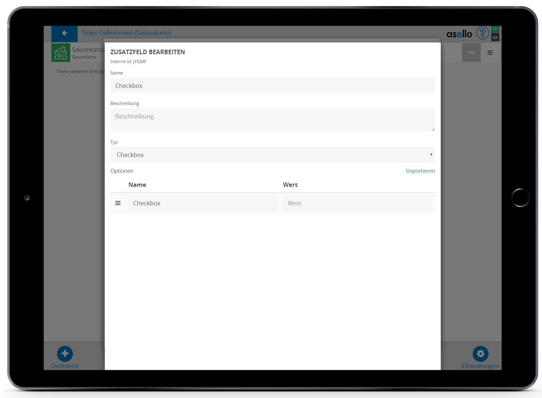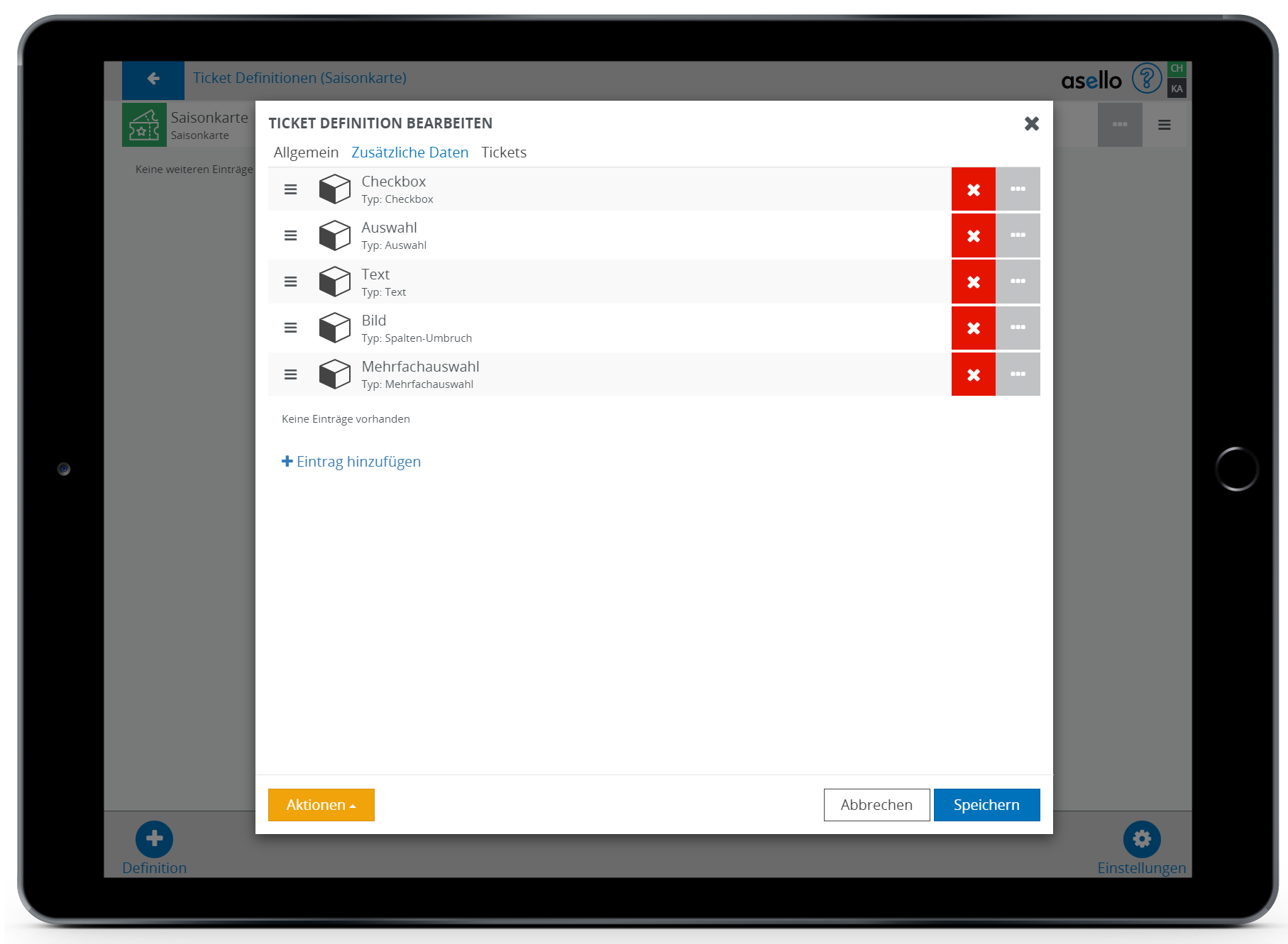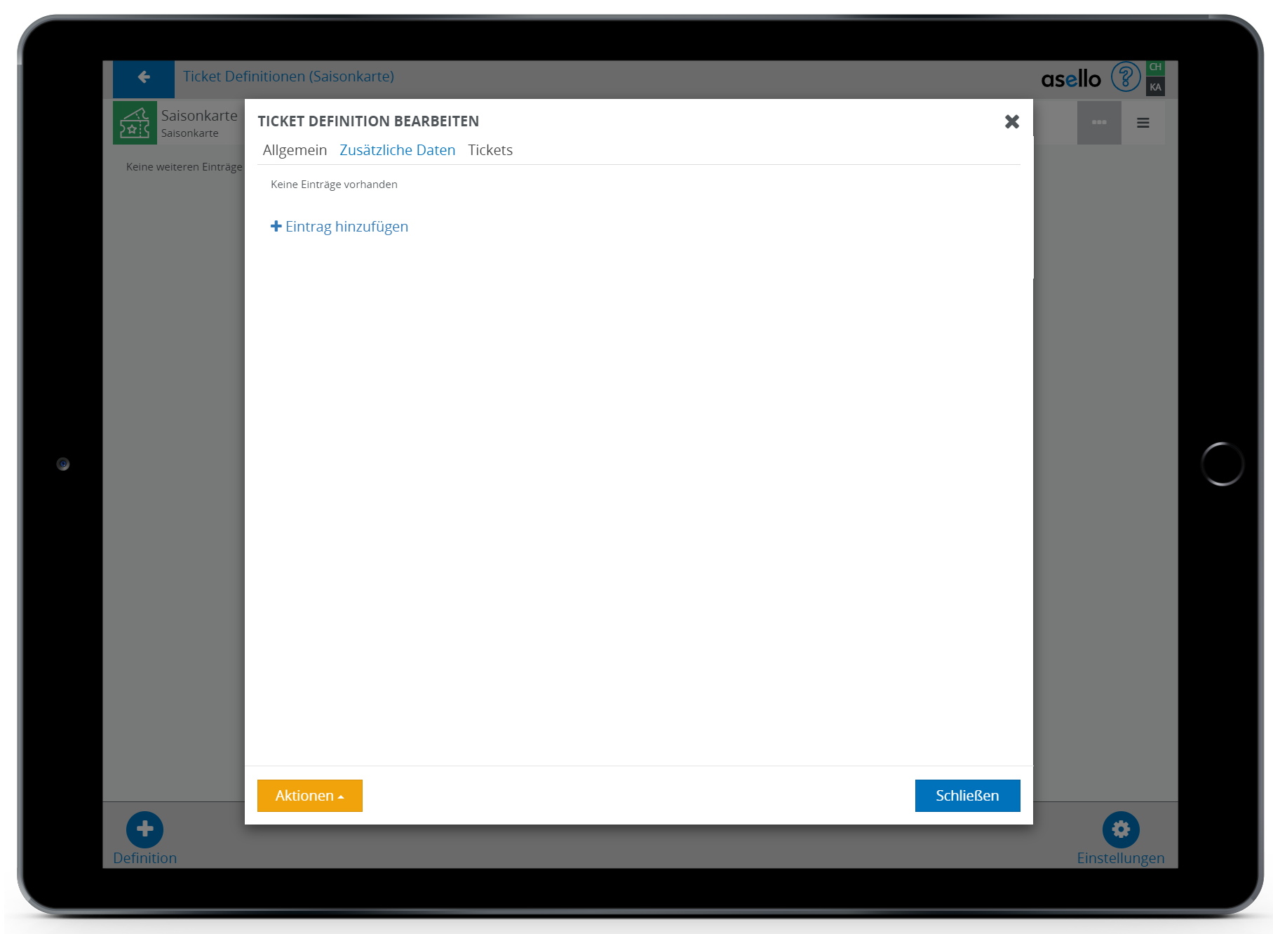Nun erscheint das Pop-up-Fenster „Ticket Definition bearbeiten“. Im Reiter „Zusätzliche Daten“, können Sie zusätzliche Daten abfragen, die für das Buchen eines Tickets erforderlich sind.