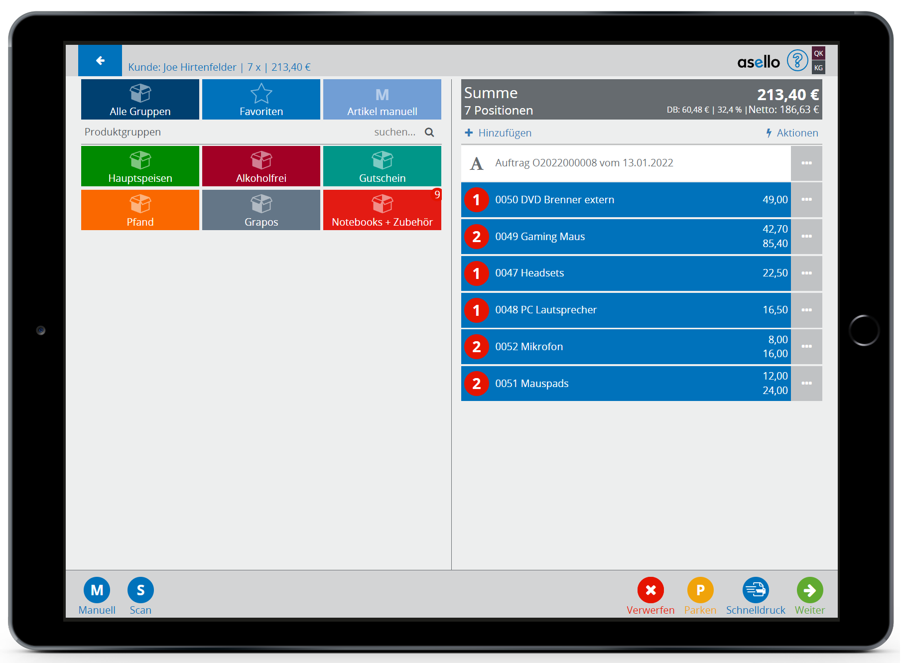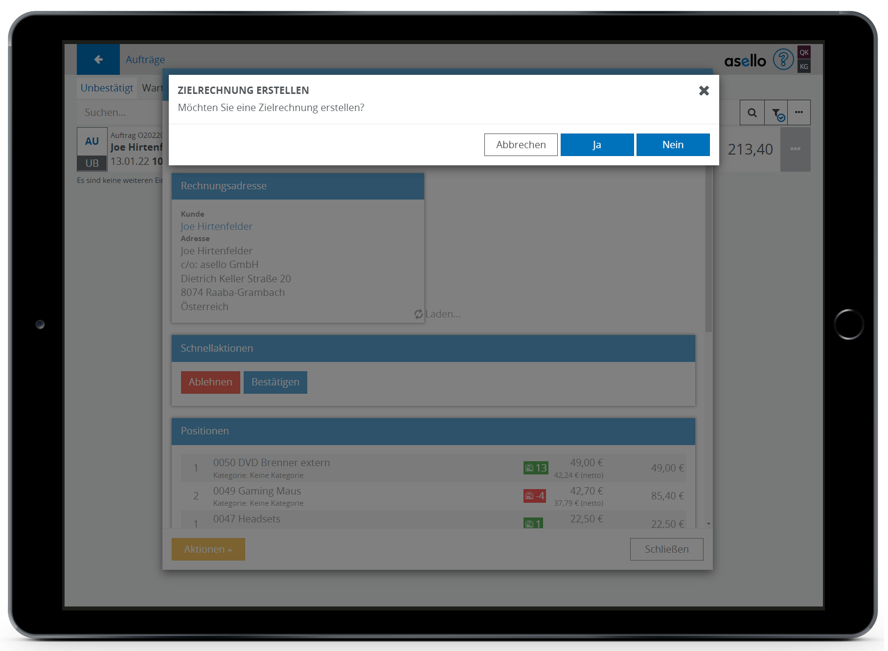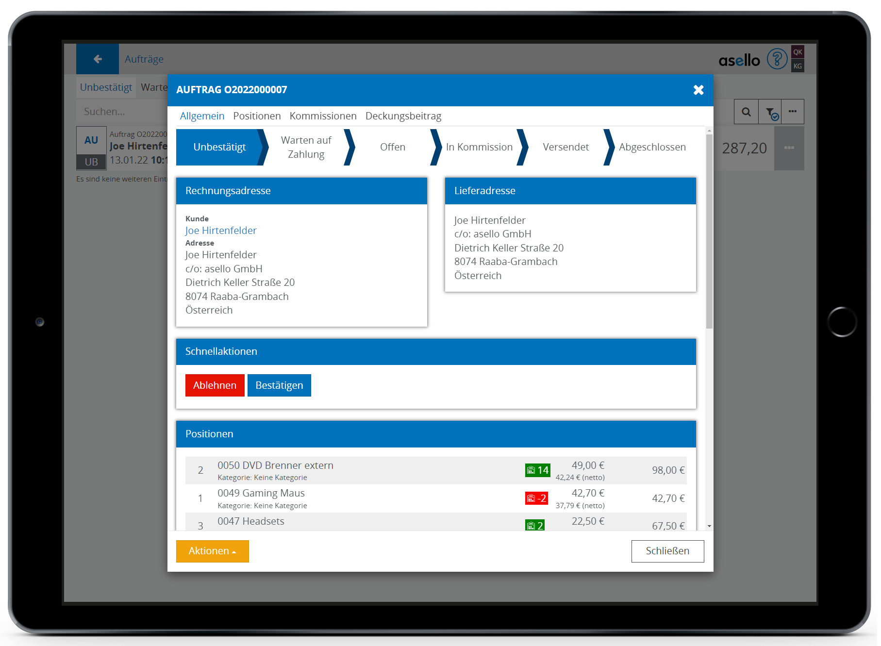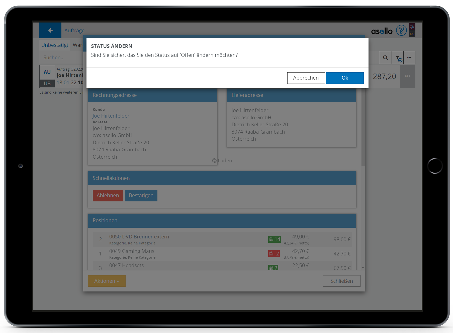 Mit dem Klick auf "Bestätigen" wird der Auftrag bestätigt. Ist der Auftrag mit der aselloSHOP Schnittstelle verbunden, wird mit der Aktion "Bestätigen" der Auftrag für den Kunden bestätigt und der Kunde per E-Mail benachrichtigt.
