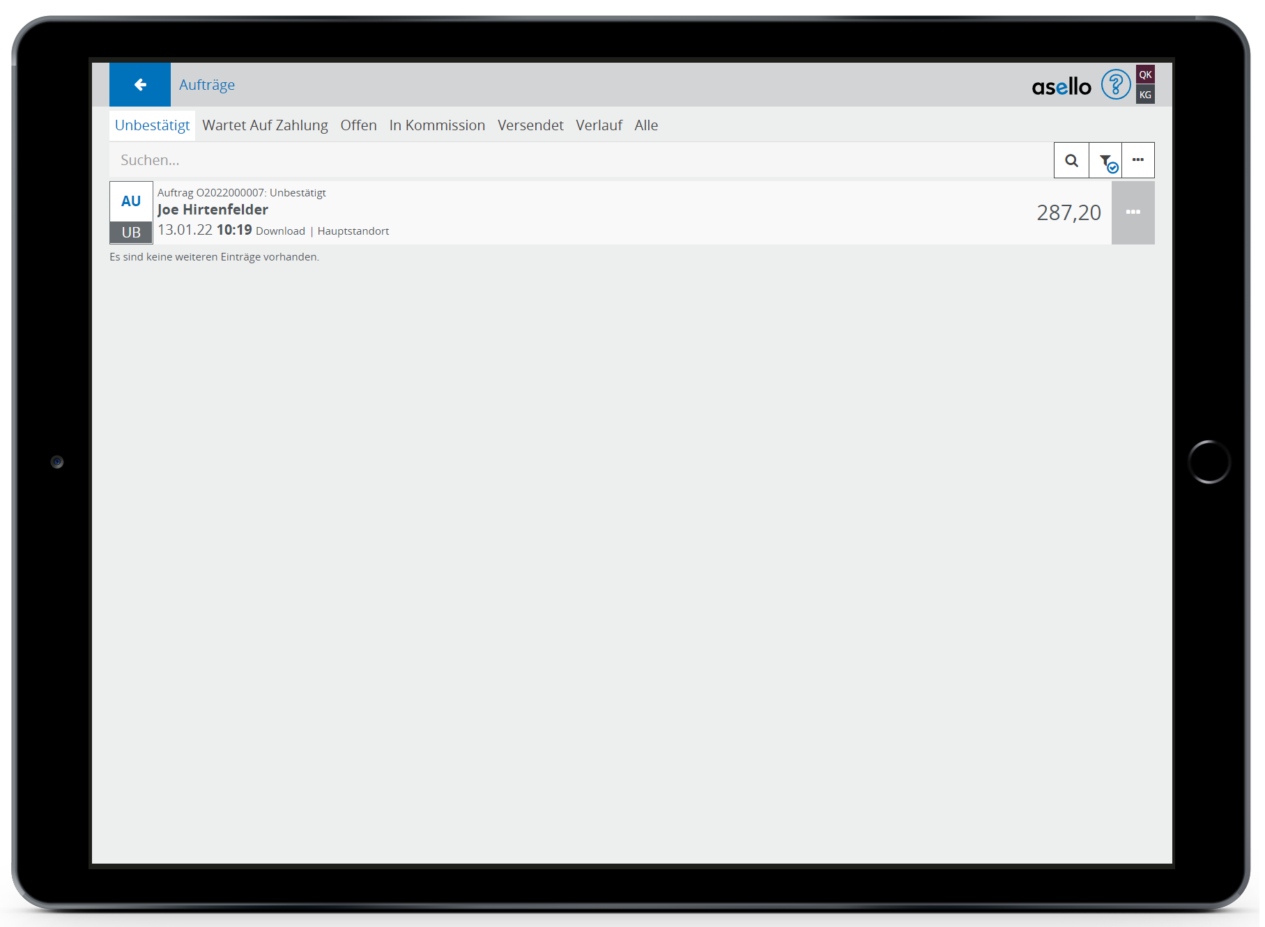 Die unbestätigten Aufträge können über unterschiedliche Ansichten in der Software bestätigt werden (Apps > Aufträge, Apps > Online-Shop Aufträge, Apps > Archiv).
