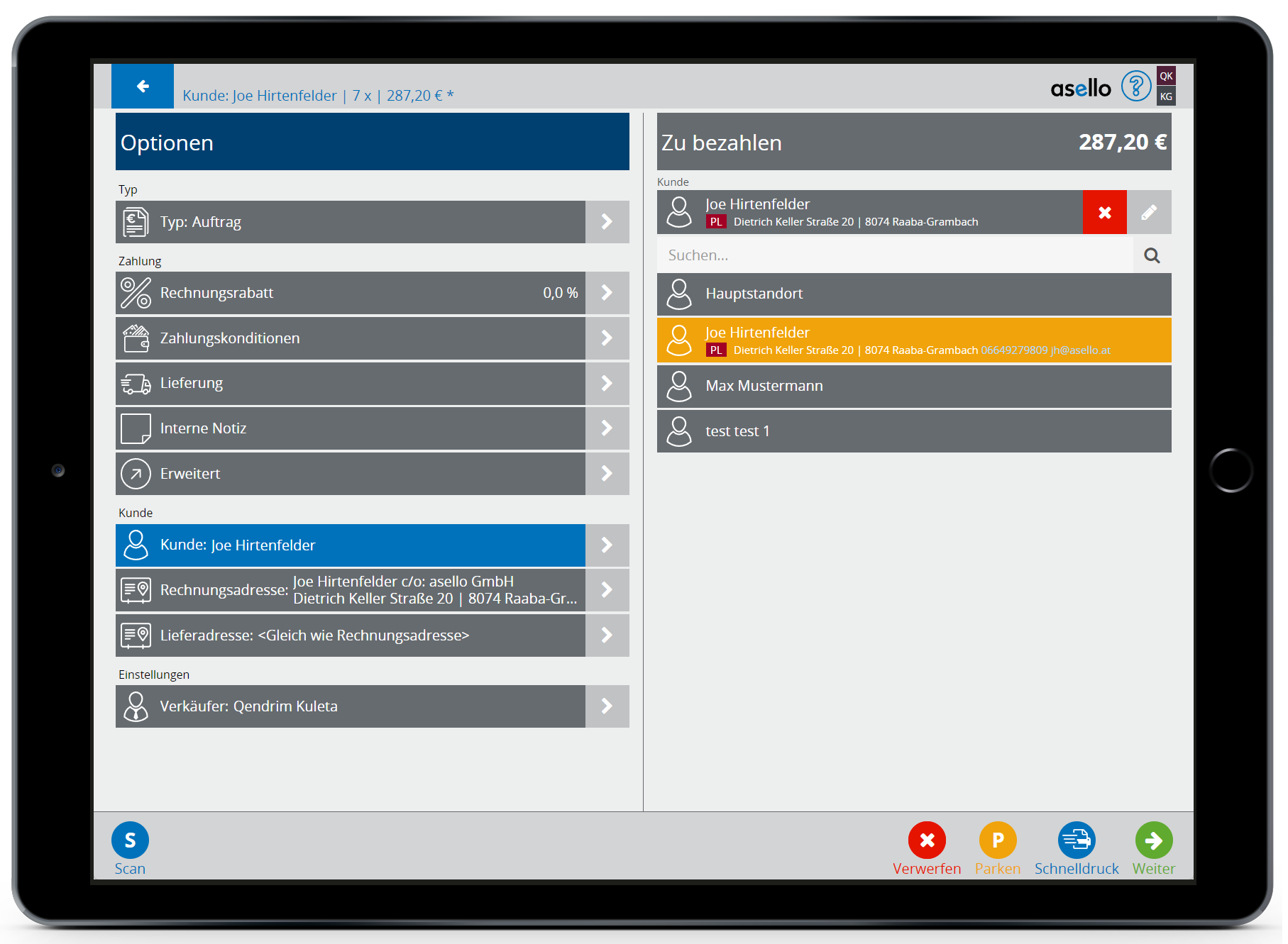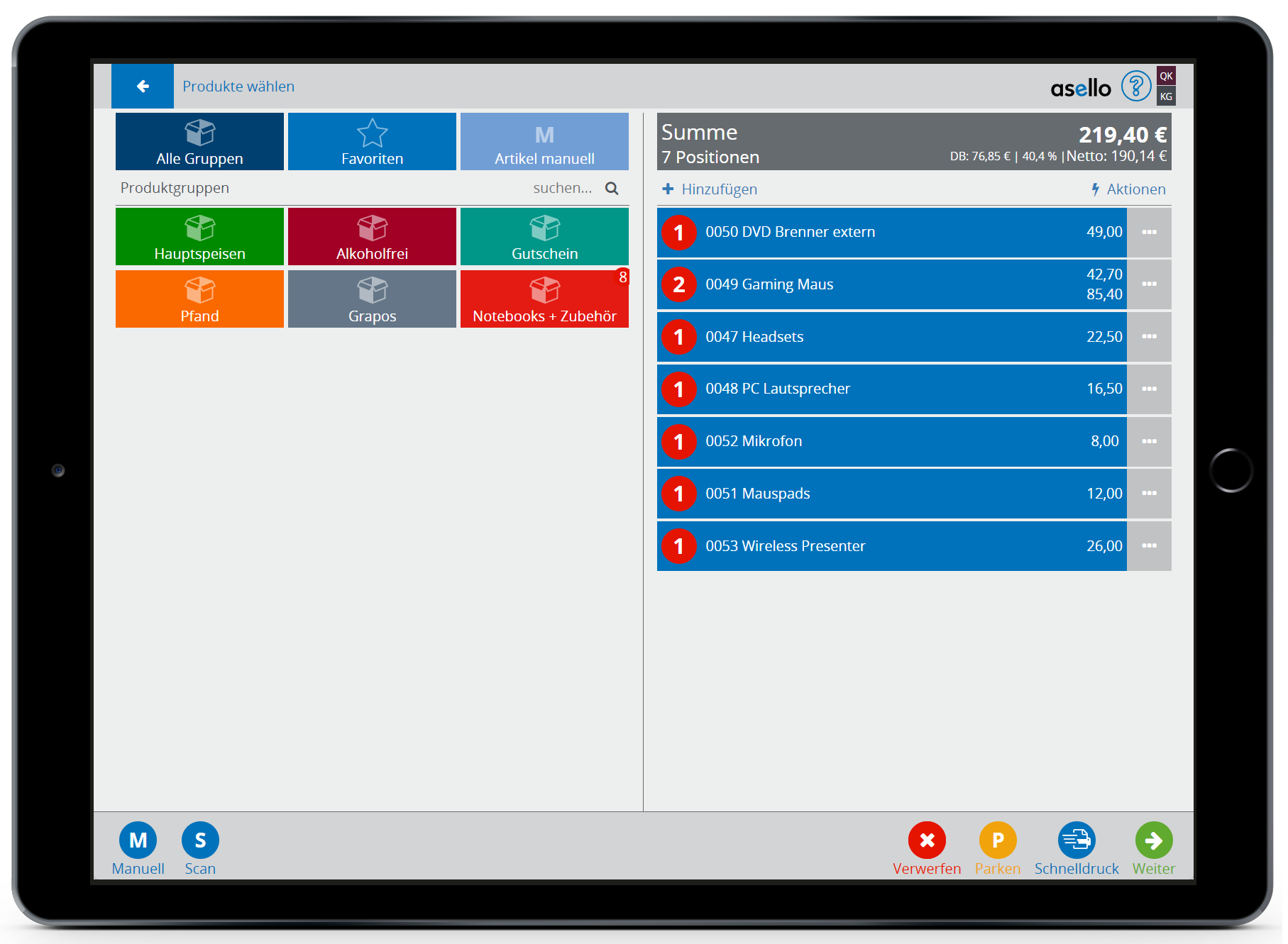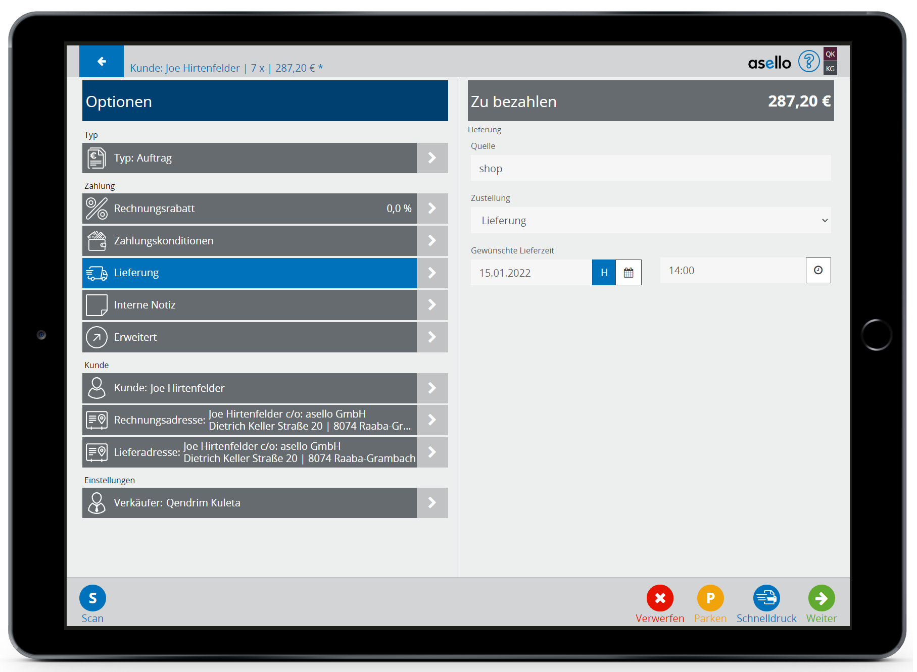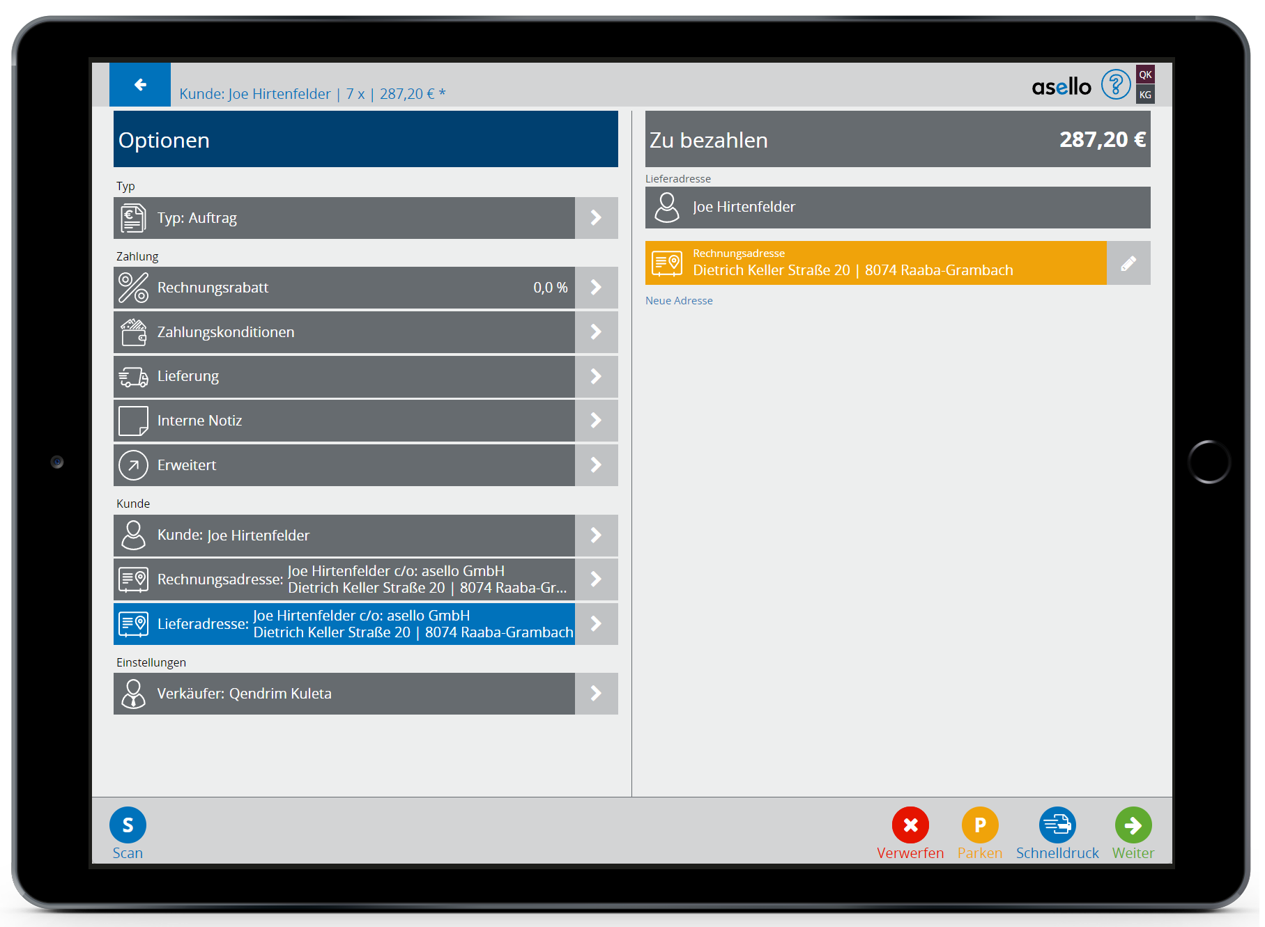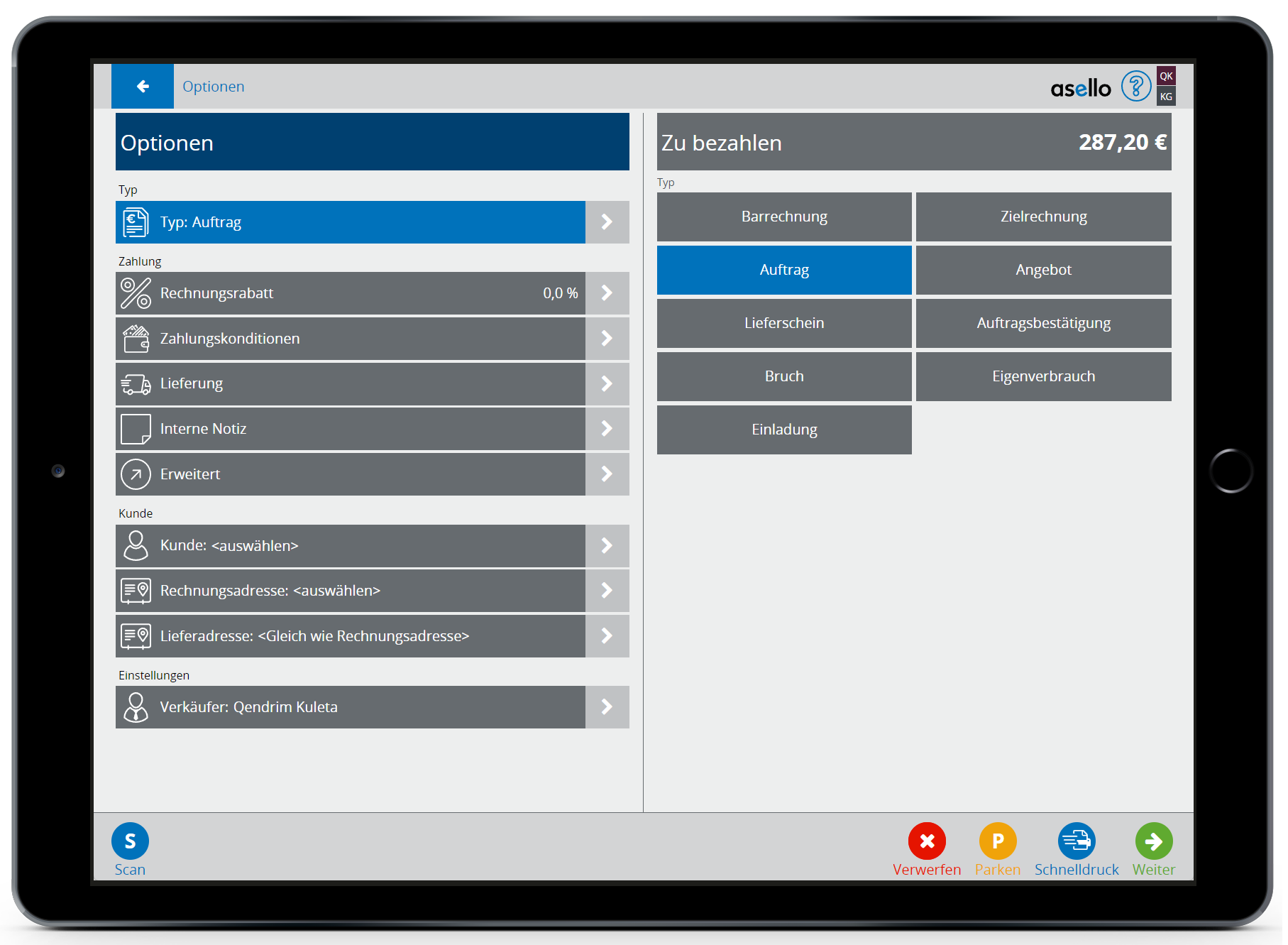 Der Auftrag wird über "Neu" Oberfläche wie die anderen Dokumente in asello erstellt. Die einzelnen Produkte werden hinzugefügt.