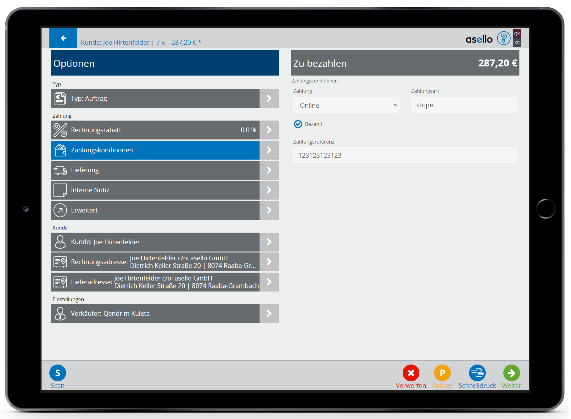 Unter Zahlungskonditionen kann die Zahlung für den Auftrag angegeben werden. Dabei stehen die Zahlungsarten "SEPA Lastschrift", "Vorkasse", "Auf Rechnung", "Kostenlos" und "Online" zur Verfügung. Bei Online-Zahlungen kann eine Zahlungsreferenz für einen einfacheren Abgleich mit dem Online-Zahlungsanbieter übergeben werden. Es kann noch angegeben werden, ob die Zahlung bereits bezahlt wurde.