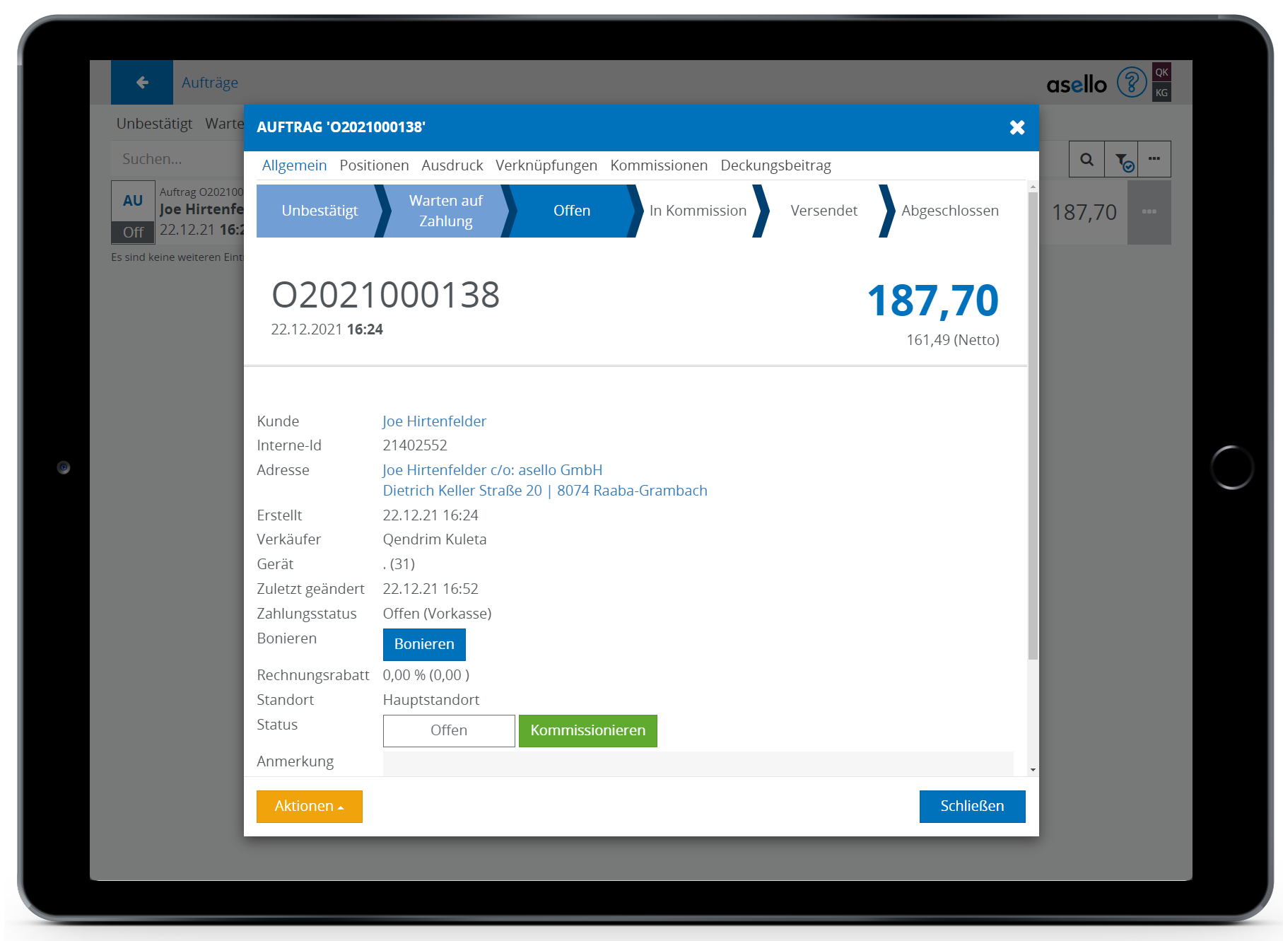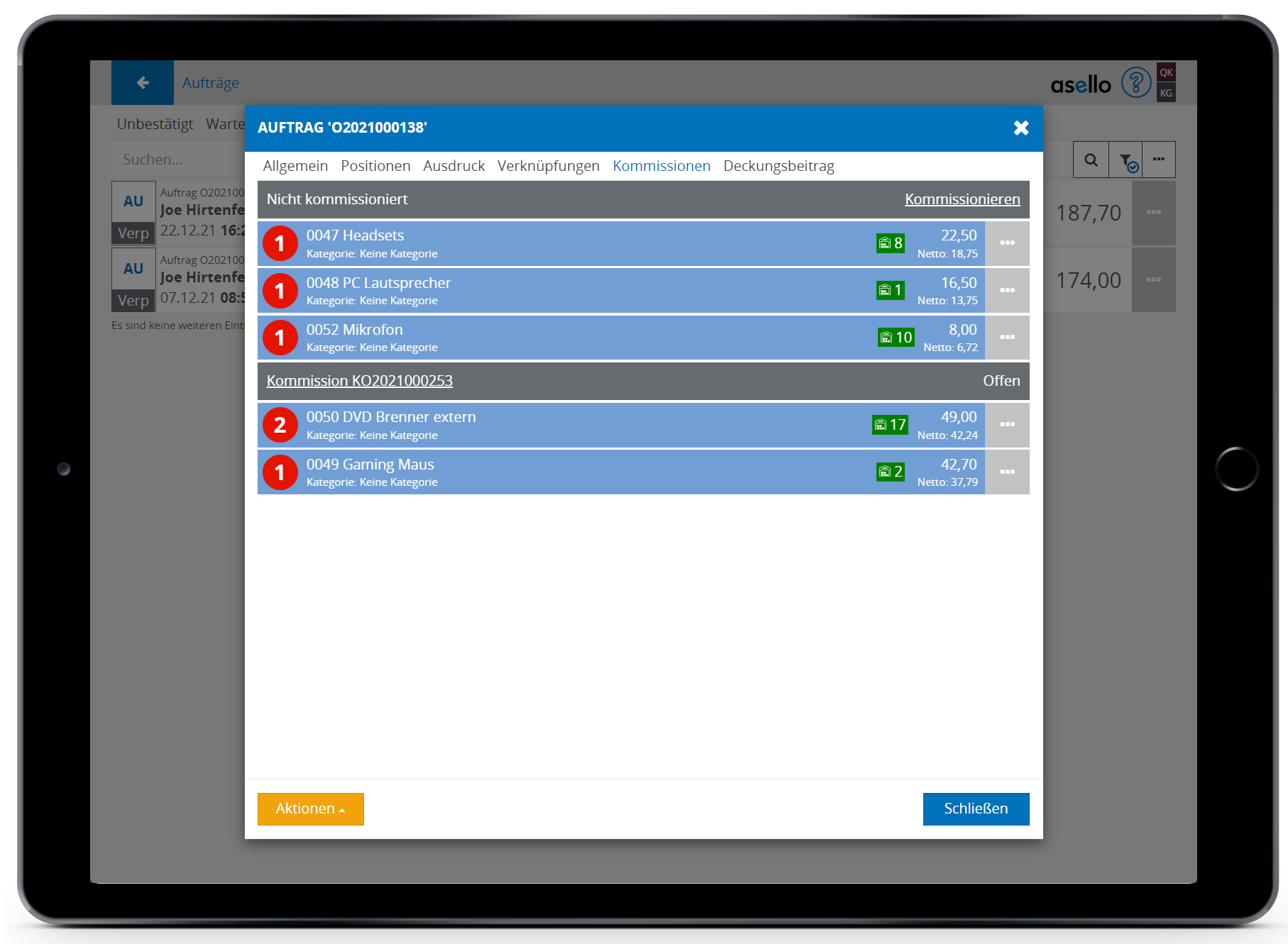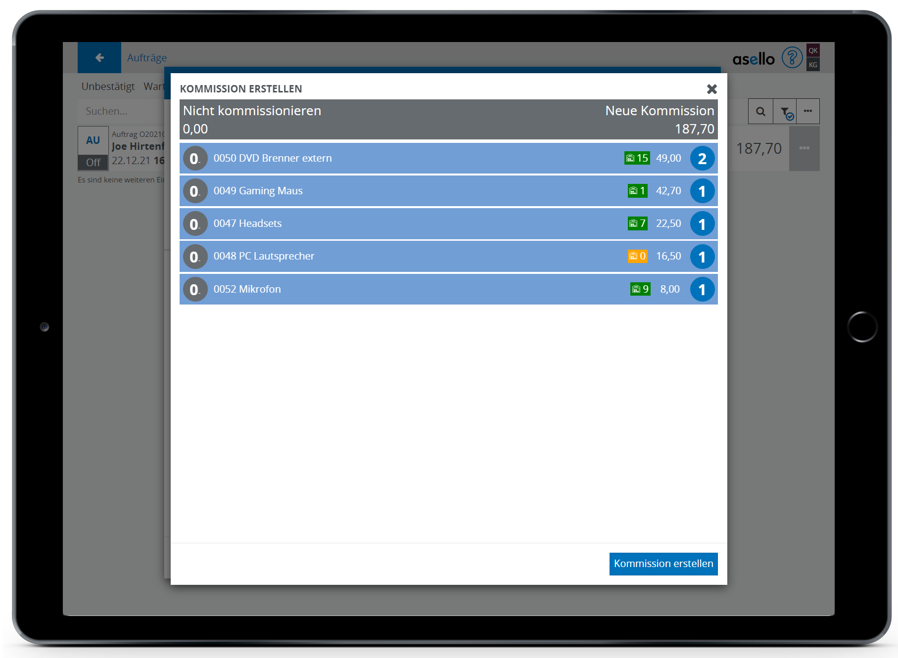 Wurde die Option Gesamtlieferung gewählt, wird für den gesamten Auftrag eine Kommission erstellt und nach der Bestätigung geöffnet. Die Kommission wird anschließend direkt geöffnet.
