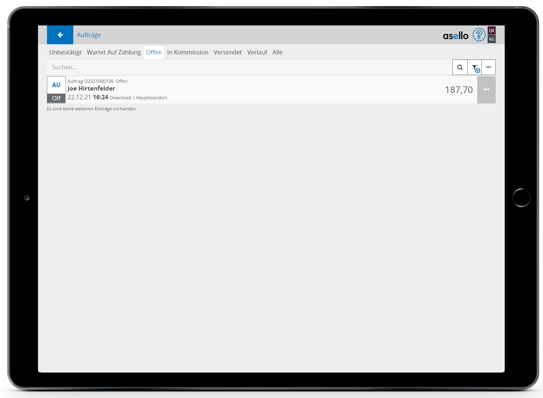 Um einen Auftrag in Kommissionen aufzuteilen, wählen Sie den Auftrag im Reiter "Offen" aus.