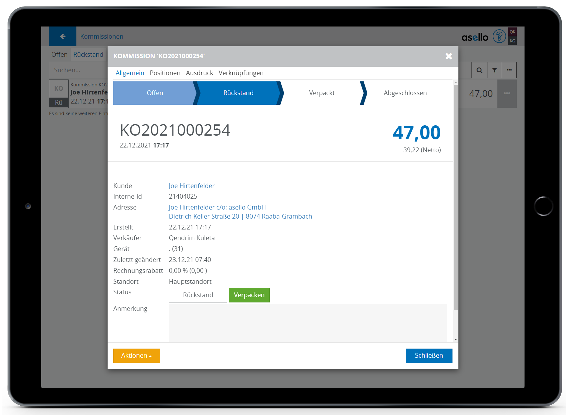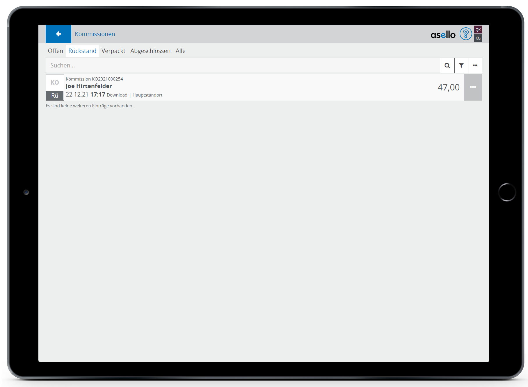 Alle Kommissionen, die sich im Status Rückstand befinden (Bestellung beim Lieferanten wurde ausgelöst, aber noch nicht geliefert), werden unter Apps > Kommissionen > Rückstand aufgelistet.