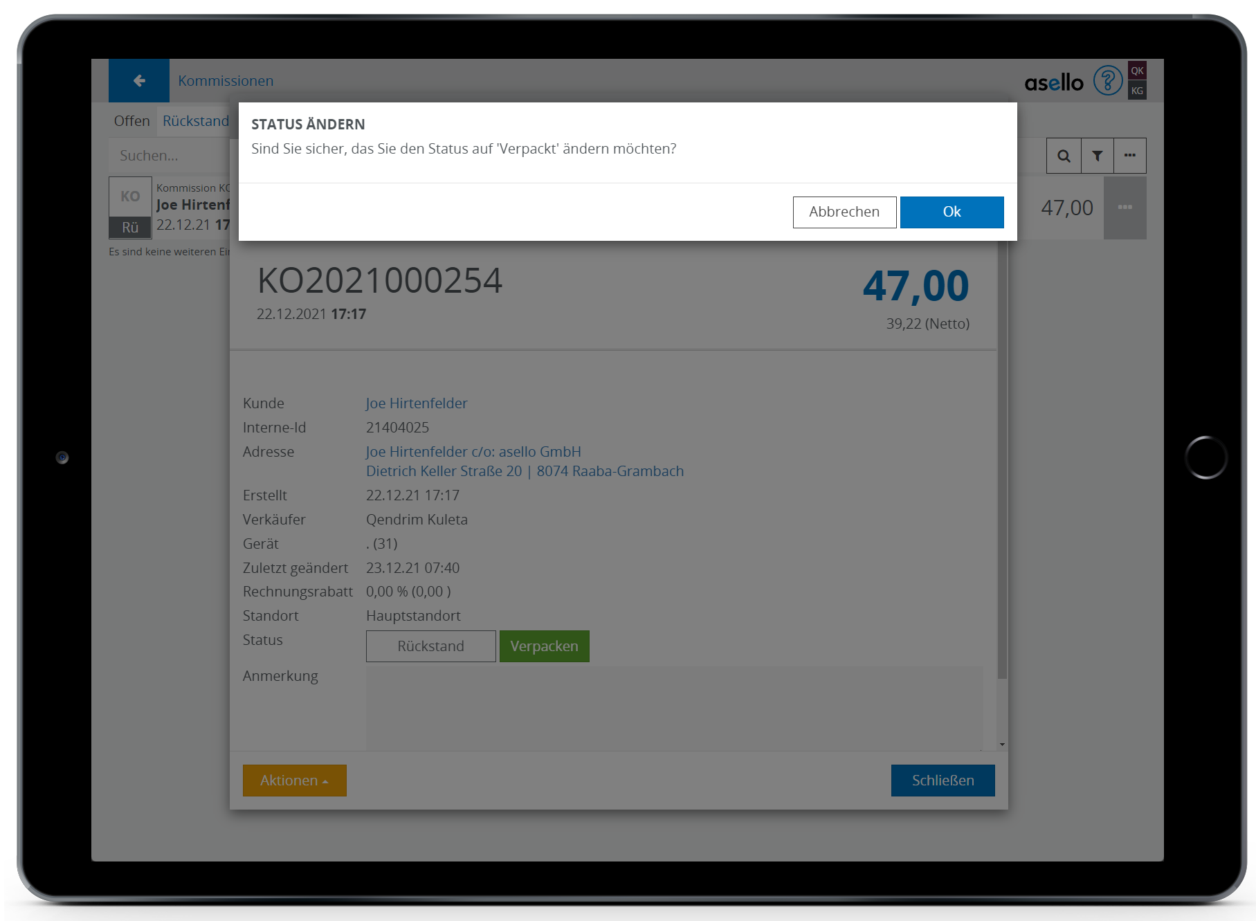 Nach der Bestätigung befindet sich die Kommission im Status "Bereit zum Versenden".