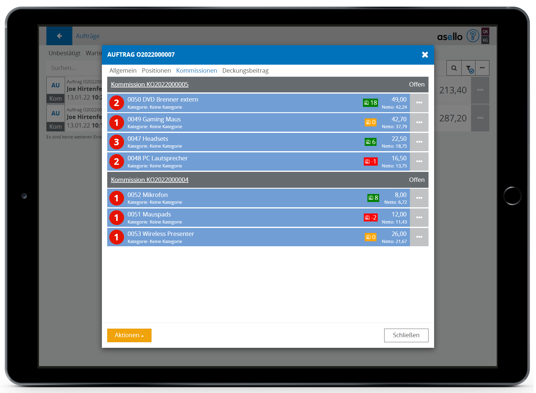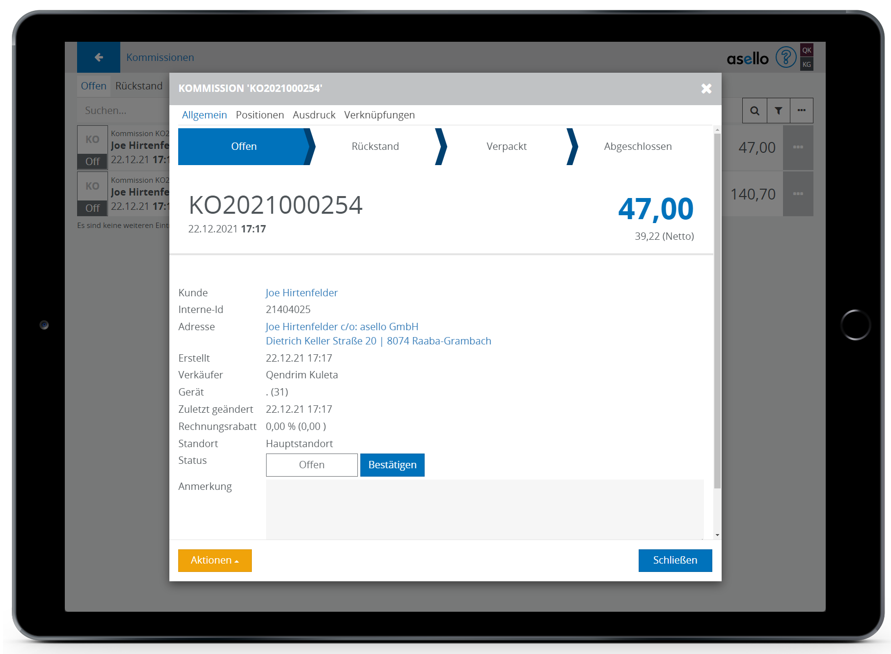 Ist die gesamte Ware lagernd, kann die Kommission direkt in das Lager gegeben werden, damit diese dann verpackt und versendet wird. Nach der Bestätigung, befindet sich die Kommission nun im Status "Bereit zum Versenden".