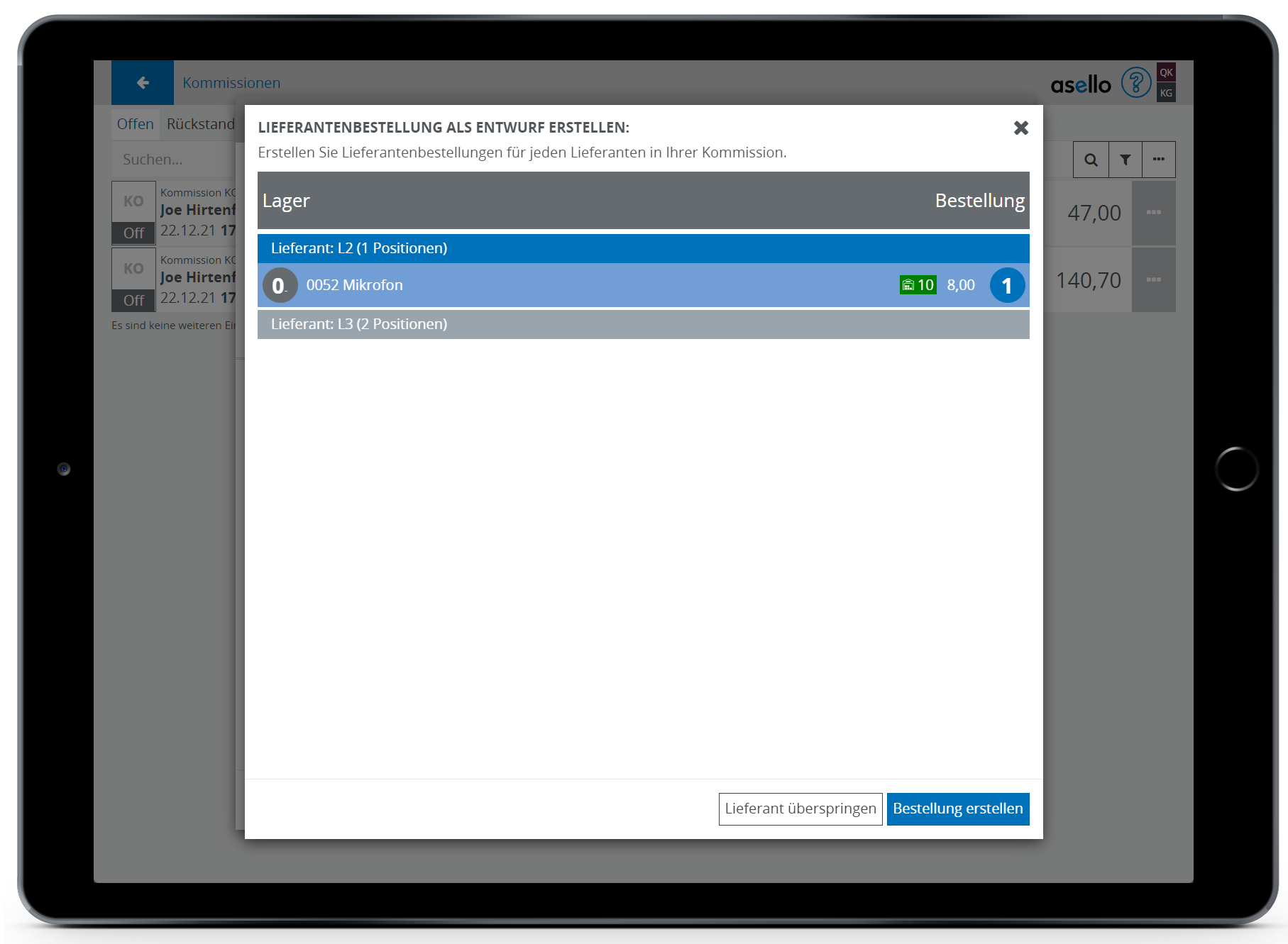 Sollte die Ware nicht lagernd sein, kann diese beim Lieferanten bestellt werden. Dabei kann im foglenden Dialog pro Lieferanten (Standard-Lieferant) eine Lieferantenbestellung als Entwurf gespeichert werden oder dieser Lieferant übersprungen werden (falls die Bestellung bereits ausgelöst wurde).