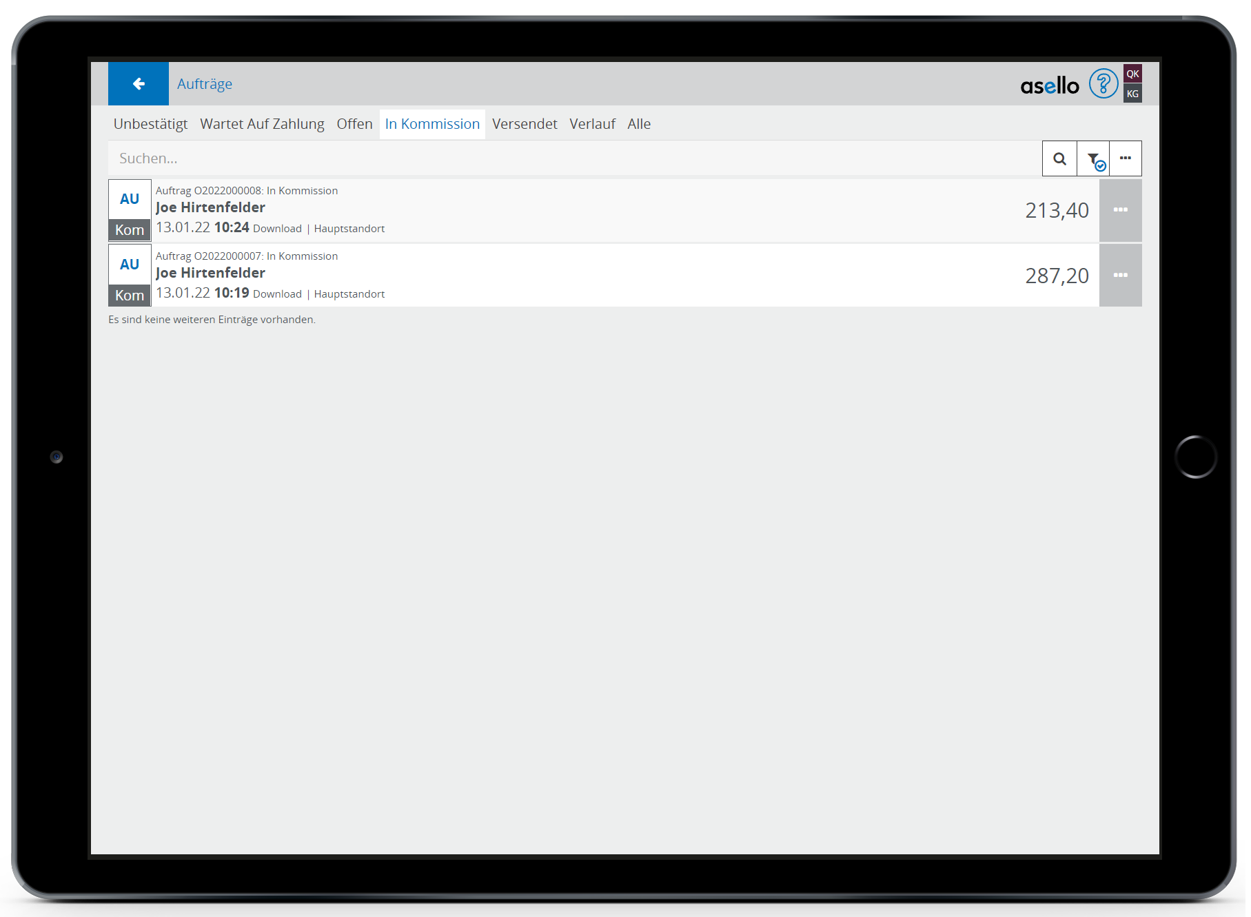 Sobald die Kommission erstellt wurde, kann diese bearbeitet werden. Das kann direkt im Zuge der Auftragsbearbeitung oder gesammelt unter Apps > Kommissionen durchgeführt werden. In diesem Beispiel gehen wir über Apps > Aufträge > In Kommission zu allen Aufträgen, die sich aktuell in Kommission befinden.