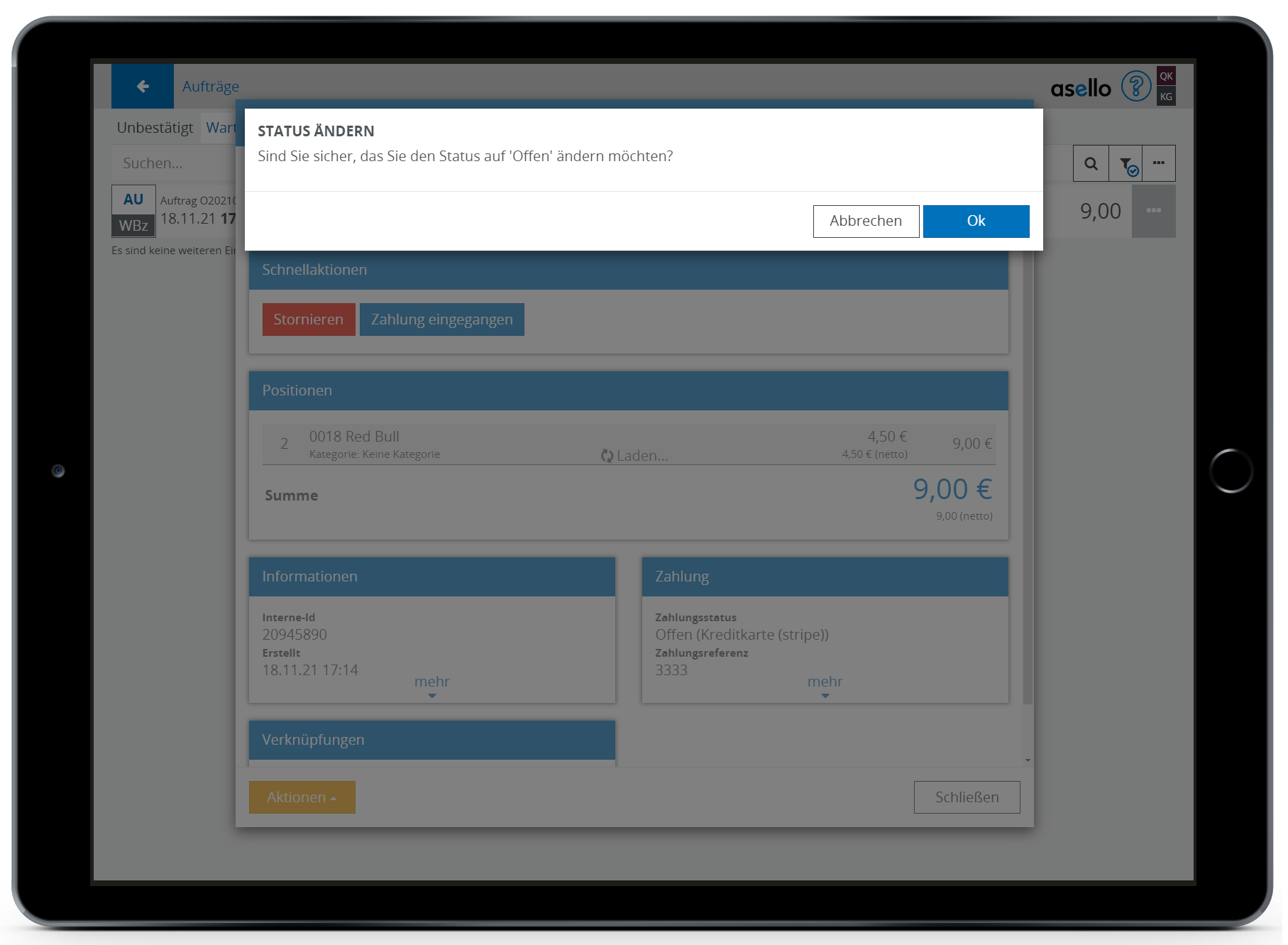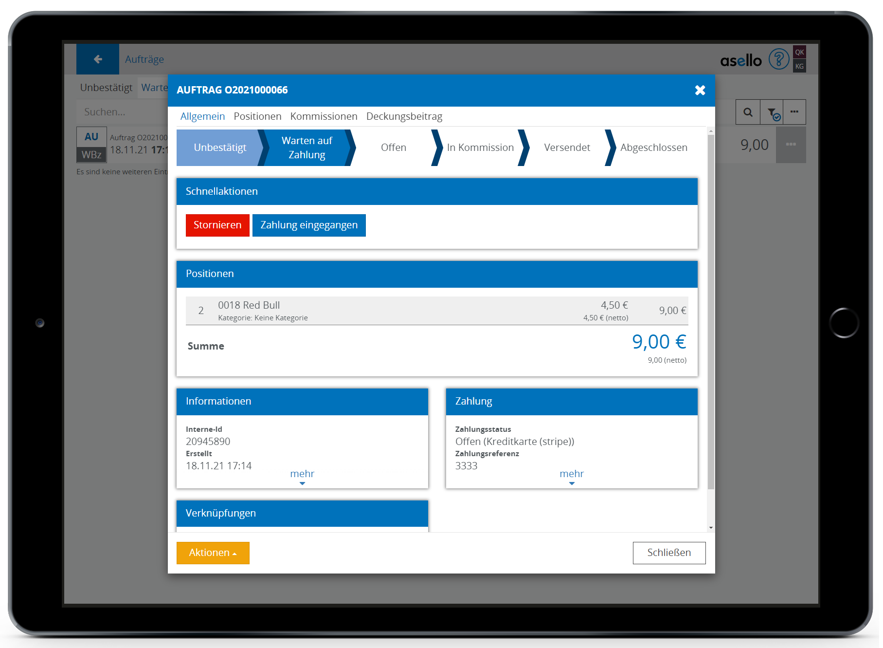Wählen Sie danach die Aktion "Zahlung eingegangen" aus, um den Status des Auftrags auf Offen zu ändern und ihn im Ablauf weiter zu bearbeiten.