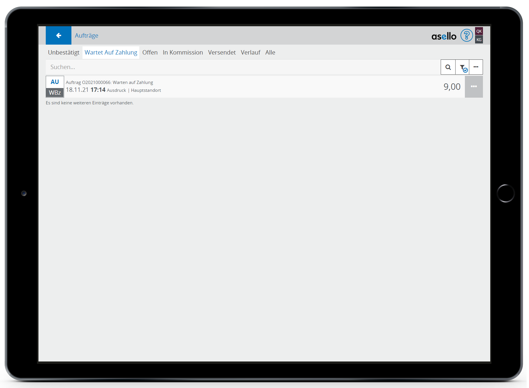 Die Aufträge, die im Status "Warten auf Zahlung" sind, werden im eigenen Reiter aufgelistet und können, nach Zahlungsart zugeordnet werden.